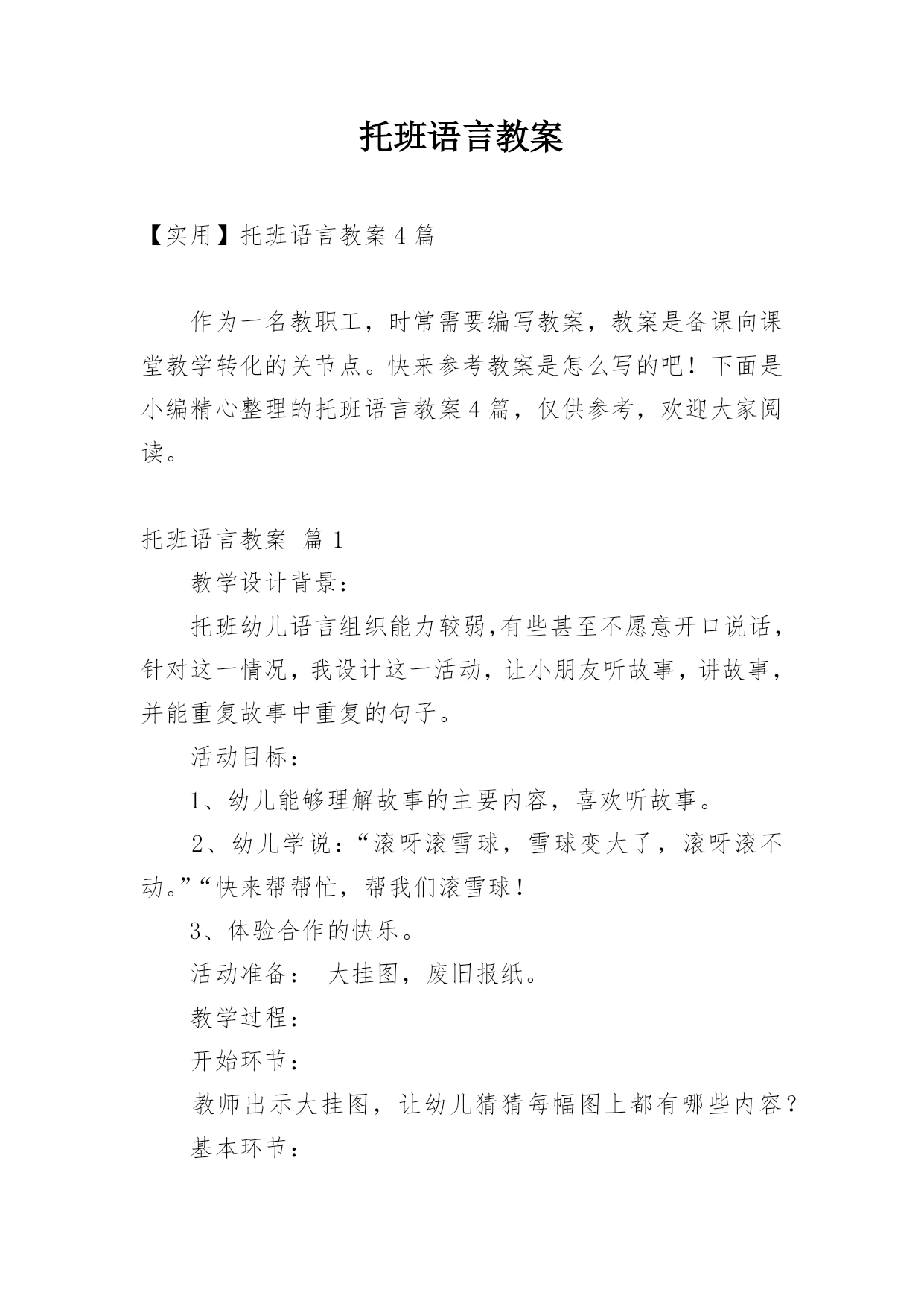 托班语言教案【实用】托班语言教案4篇作为一名教职工,时常需要编写教案,教案是备课向课堂教学转化的关节点。快来参考教案是怎么写的吧!下面是小编精心整理的托班语言教案4篇,仅供参考,欢迎大家阅读。托班语言教案篇1教学设计背景:托班幼儿语言组织能力较弱,有些甚至不愿意开口说话,针对这一情况,我设计这一活动,让小朋友听故事,讲故事,并能重复故事中重复的句子。活动目标:1、幼儿能够理解故事的主要内容,喜欢听故事。2、幼儿学说:“滚呀滚雪球,雪球变大了,滚呀滚不动。”“快来帮帮忙,帮我们滚雪球!3、体验合作的快乐。活
