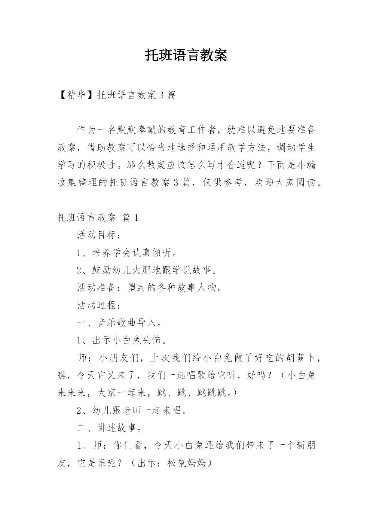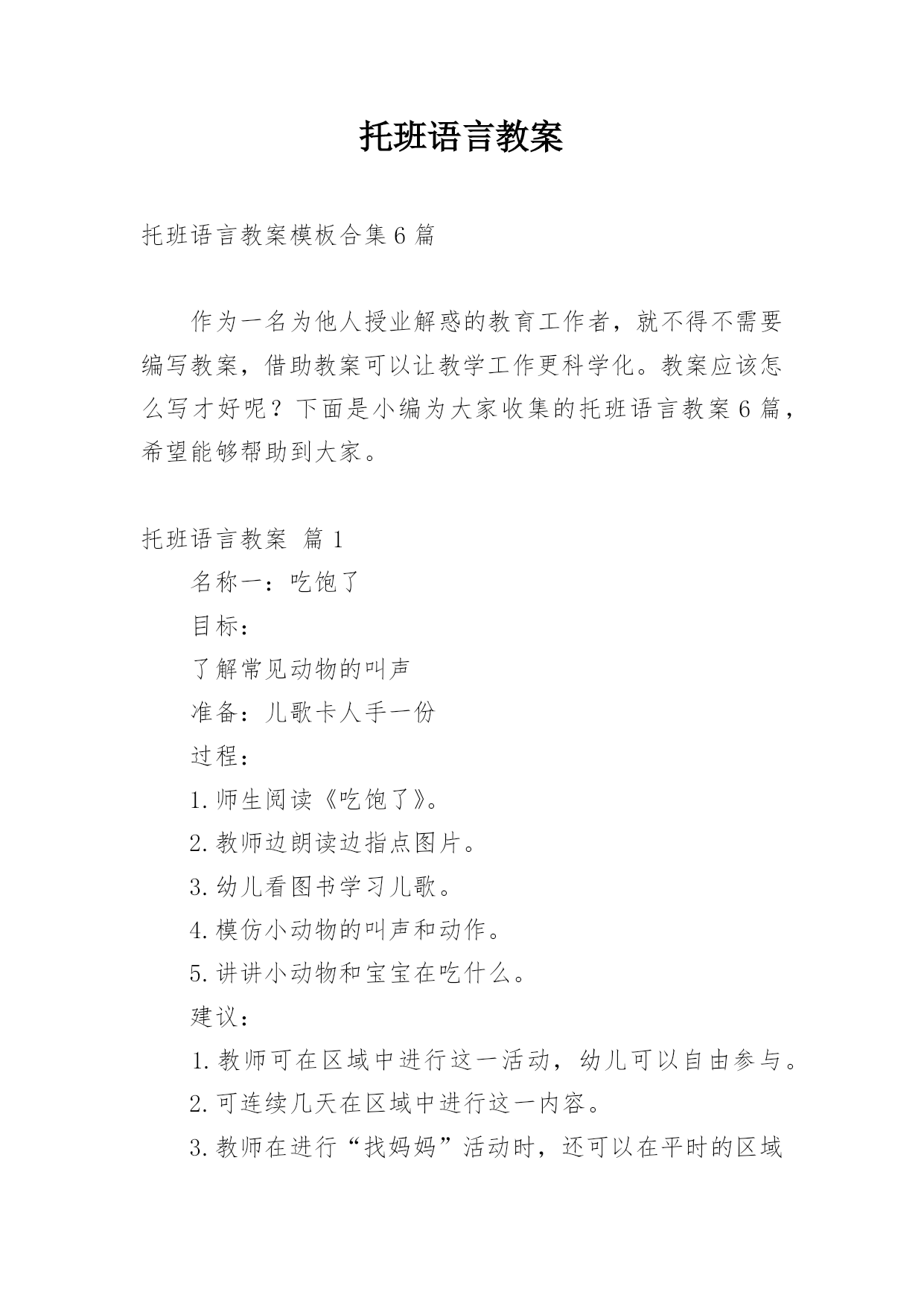 托班语言教案托班语言教案模板合集6篇作为一名为他人授业解惑的教育工作者,就不得不需要编写教案,借助教案可以让教学工作更科学化。教案应该怎么写才好呢?下面是小编为大家收集的托班语言教案6篇,希望能够帮助到大家。托班语言教案篇1名称一:吃饱了目标:了解常见动物的叫声准备:儿歌卡人手一份过程:1.师生阅读《吃饱了》。2.教师边朗读边指点图片。3.幼儿看图书学习儿歌。4.模仿小动物的叫声和动作。5.讲讲小动物和宝宝在吃什么。建议:1.教师可在区域中进行这一活动,幼儿可以自由参与。2.可连续几天在区域中进行这一内容
