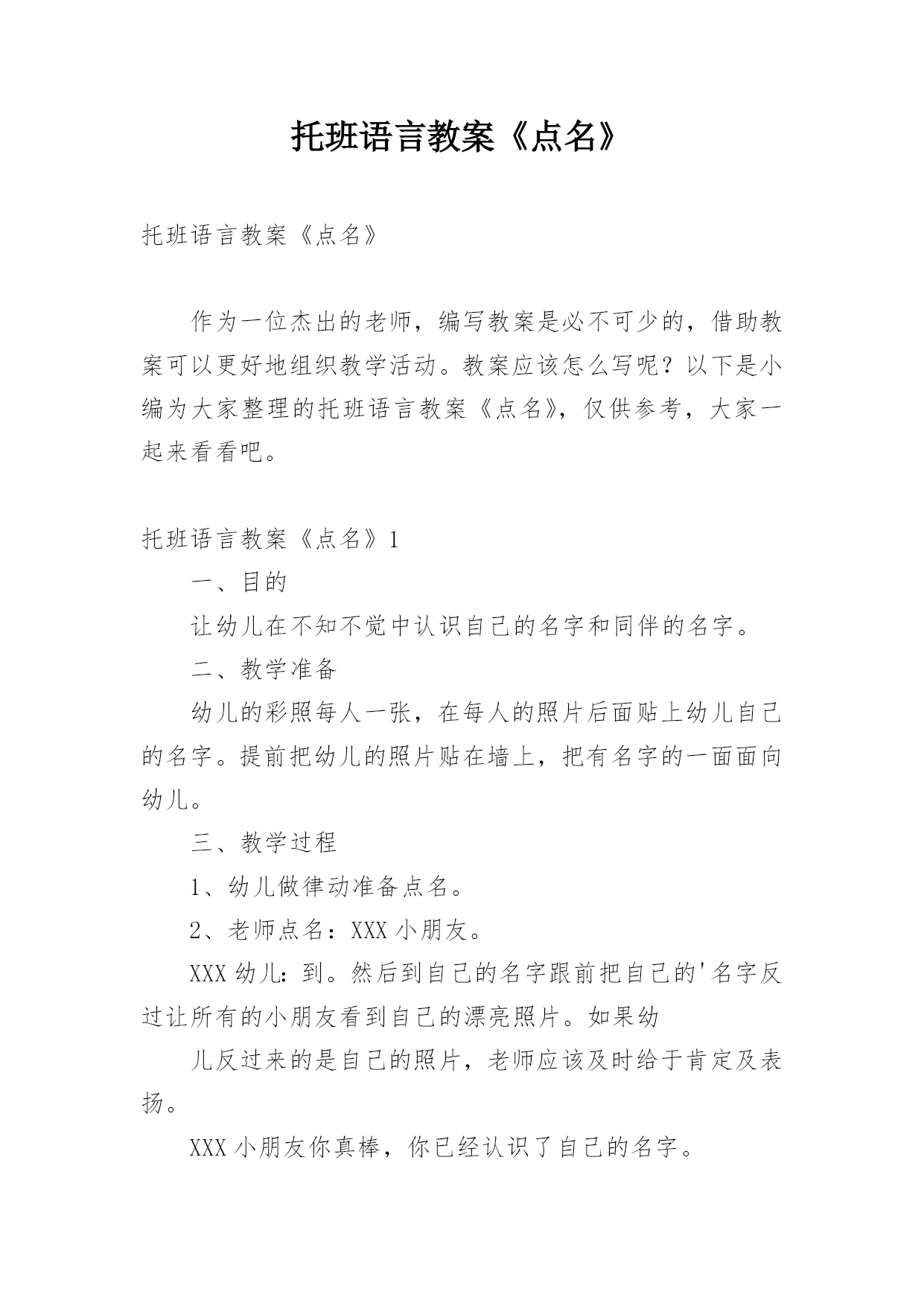 托班语言教案《点名》托班语言教案《点名》作为一位杰出的老师,编写教案是必不可少的,借助教案可以更好地组织教学活动。教案应该怎么写呢?以下是小编为大家整理的托班语言教案《点名》,仅供参考,大家一起来看看吧。托班语言教案《点名》1一、目的让幼儿在不知不觉中认识自己的名字和同伴的名字。二、教学准备幼儿的彩照每人一张,在每人的照片后面贴上幼儿自己的名字。提前把幼儿的照片贴在墙上,把有名字的一面面向幼儿。三、教学过程1、幼儿做律动准备点名。2、老师点名:XXX小朋友。XXX幼儿:到。然后到自己的名字跟前把自己的'名