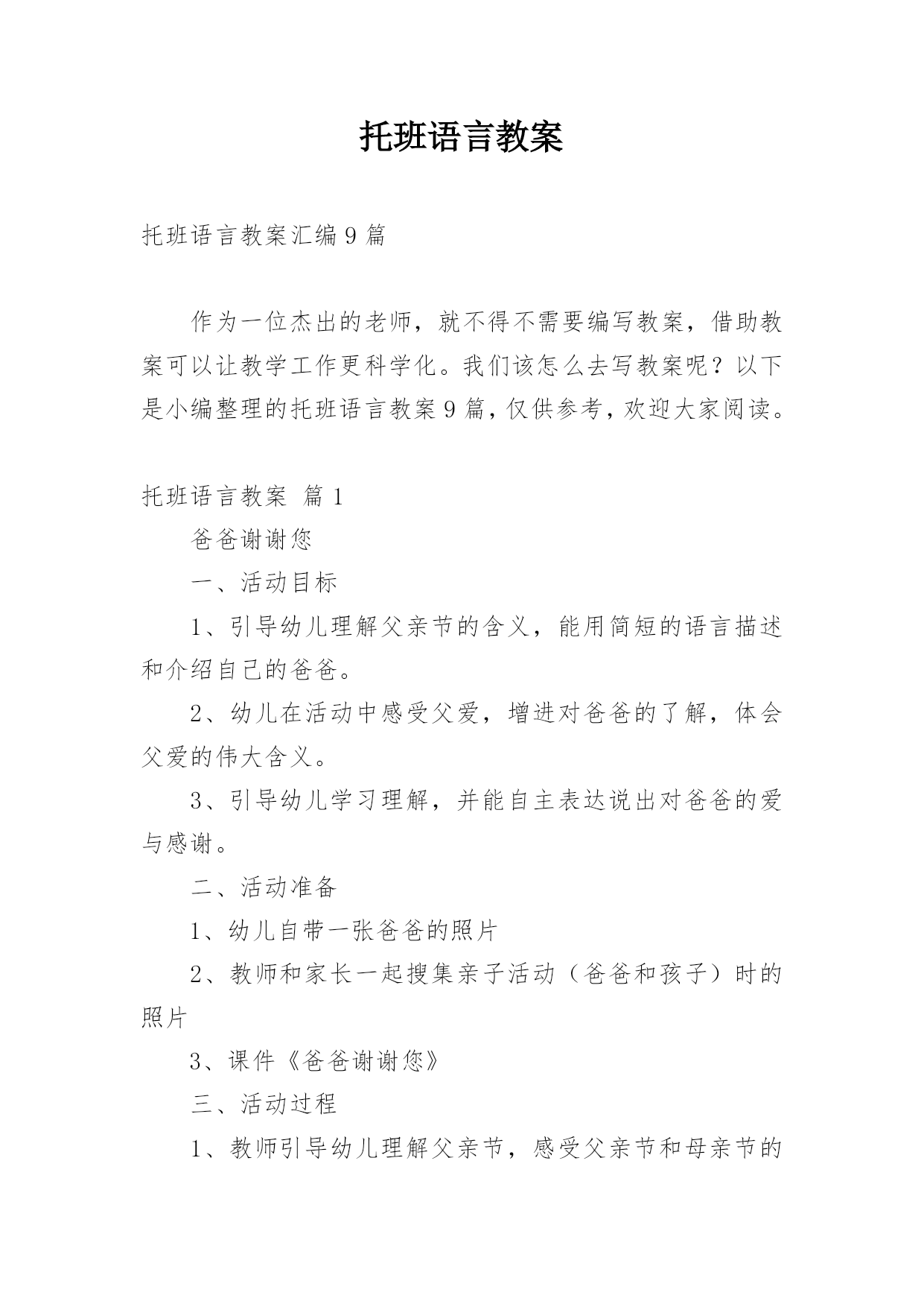托班语言教案托班语言教案汇编9篇作为一位杰出的老师,就不得不需要编写教案,借助教案可以让教学工作更科学化。我们该怎么去写教案呢?以下是小编整理的托班语言教案9篇,仅供参考,欢迎大家阅读。托班语言教案篇1爸爸谢谢您一、活动目标1、引导幼儿理解父亲节的含义,能用简短的语言描述和介绍自己的爸爸。2、幼儿在活动中感受父爱,增进对爸爸的了解,体会父爱的伟大含义。3、引导幼儿学习理解,并能自主表达说出对爸爸的爱与感谢。二、活动准备1、幼儿自带一张爸爸的照片2、教师和家长一起搜集亲子活动(爸爸和孩子)时的照片3、课件《