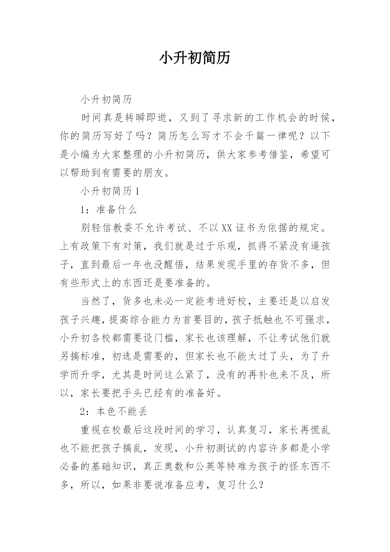 小升初简历小升初简历时间真是转瞬即逝,又到了寻求新的工作机会的时候,你的简历写好了吗?简历怎么写才不会千篇一律呢?以下是小编为大家整理的小升初简历,供大家参考借鉴,希望可以帮助到有需要的朋友。小升初简历11:准备什么别轻信教委不允许考试、不以XX证书为依据的规定。上有政策下有对策,我们就是过于乐观,抓得不紧没有逼孩子,直到最后一年也没醒悟,结果发现手里的存货不多,但有些形式上的东西还是要准备的。当然了,货多也未必一定能考进好校,主要还是以启发孩子兴趣,提高综合能力为首要目的,孩子抵触也不可强求,小升初各校