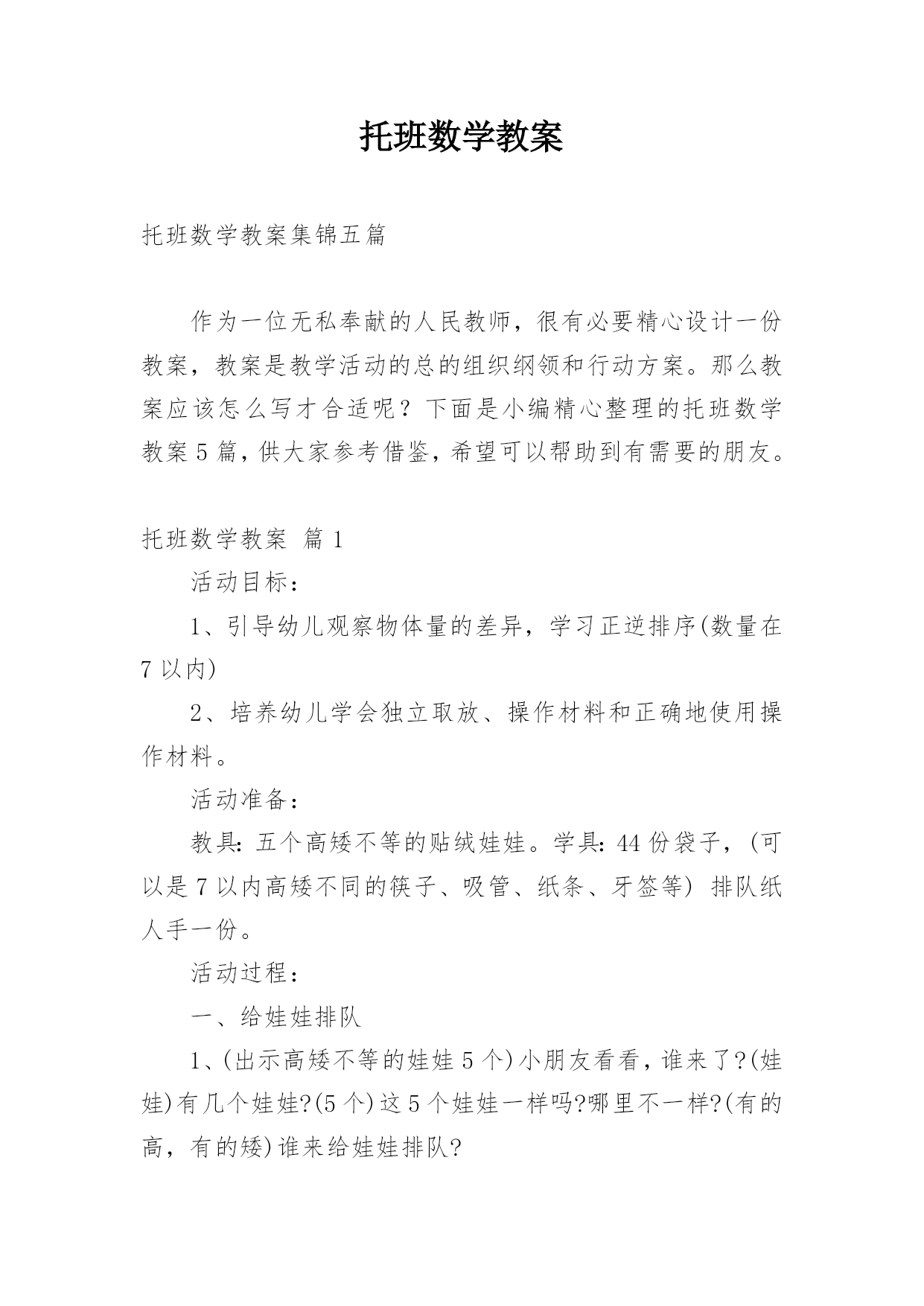 托班数学教案托班数学教案集锦五篇作为一位无私奉献的人民教师,很有必要精心设计一份教案,教案是教学活动的总的组织纲领和行动方案。那么教案应该怎么写才合适呢?下面是小编精心整理的托班数学教案5篇,供大家参考借鉴,希望可以帮助到有需要的朋友。托班数学教案篇1活动目标:1、引导幼儿观察物体量的差异,学习正逆排序(数量在7以内)2、培养幼儿学会独立取放、操作材料和正确地使用操作材料。活动准备:教具:五个高矮不等的贴绒娃娃。学具:44份袋子,(可以是7以内高矮不同的筷子、吸管、纸条、牙签等)排队纸人手一份。活动过程:
