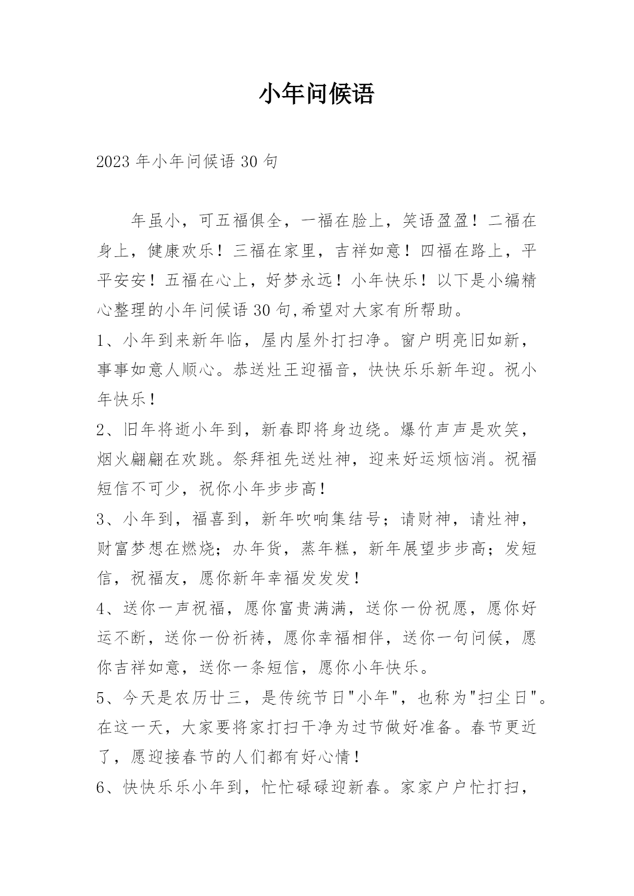小年问候语2023年小年问候语30句年虽小,可五福俱全,一福在脸上,笑语盈盈!二福在身上,健康欢乐!三福在家里,吉祥如意!四福在路上,平平安安!五福在心上,好梦永远!小年快乐!以下是小编精心整理的小年问候语30句,希望对大家有所帮助。1、小年到来新年临,屋内屋外打扫净。窗户明亮旧如新,事事如意人顺心。恭送灶王迎福音,快快乐乐新年迎。祝小年快乐!2、旧年将逝小年到,新春即将身边绕。爆竹声声是欢笑,烟火翩翩在欢跳。祭拜祖先送灶神,迎来好运烦恼消。祝福短信不可少,祝你小年步步高!3、小年到,福喜到,新年吹响集结
