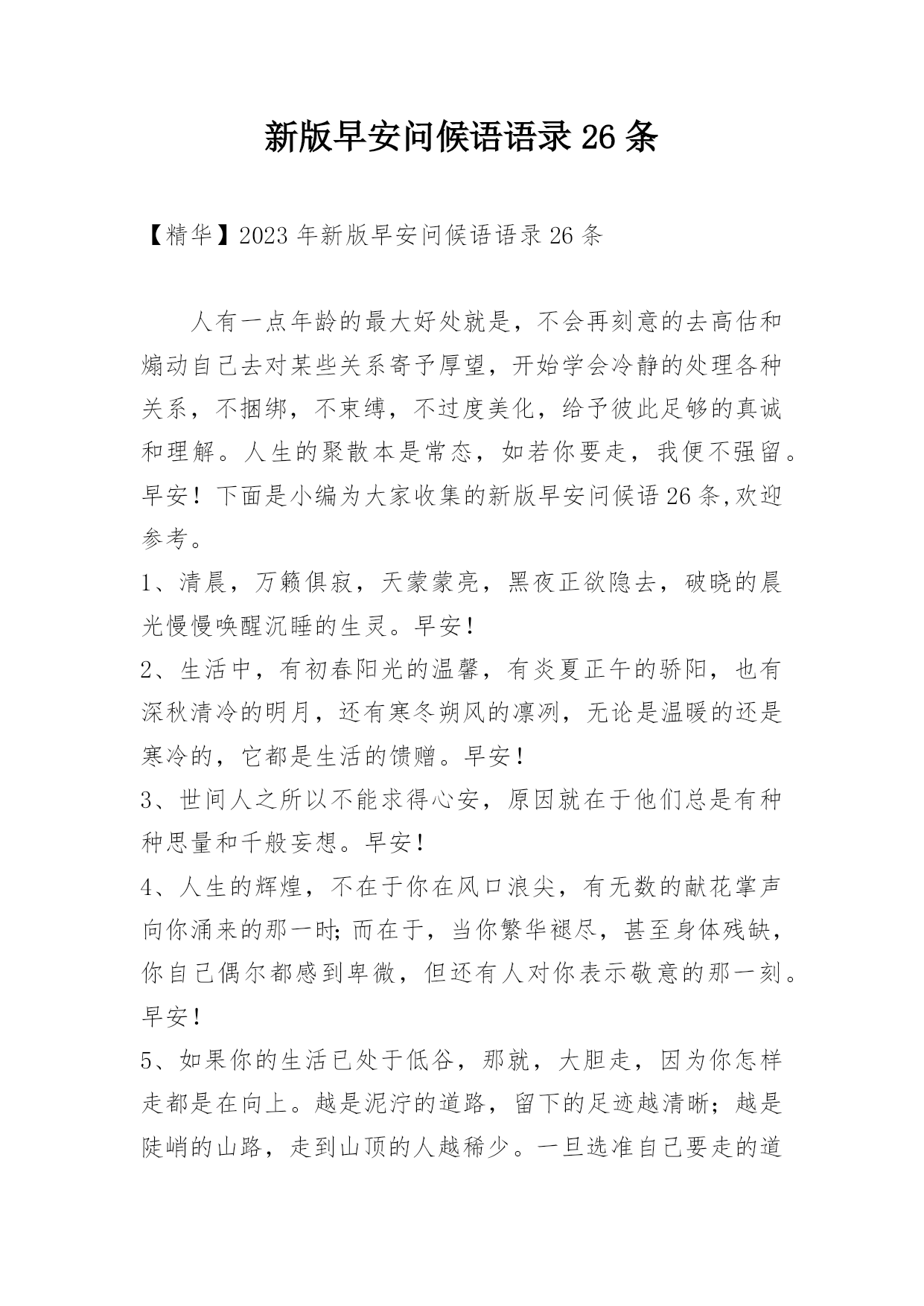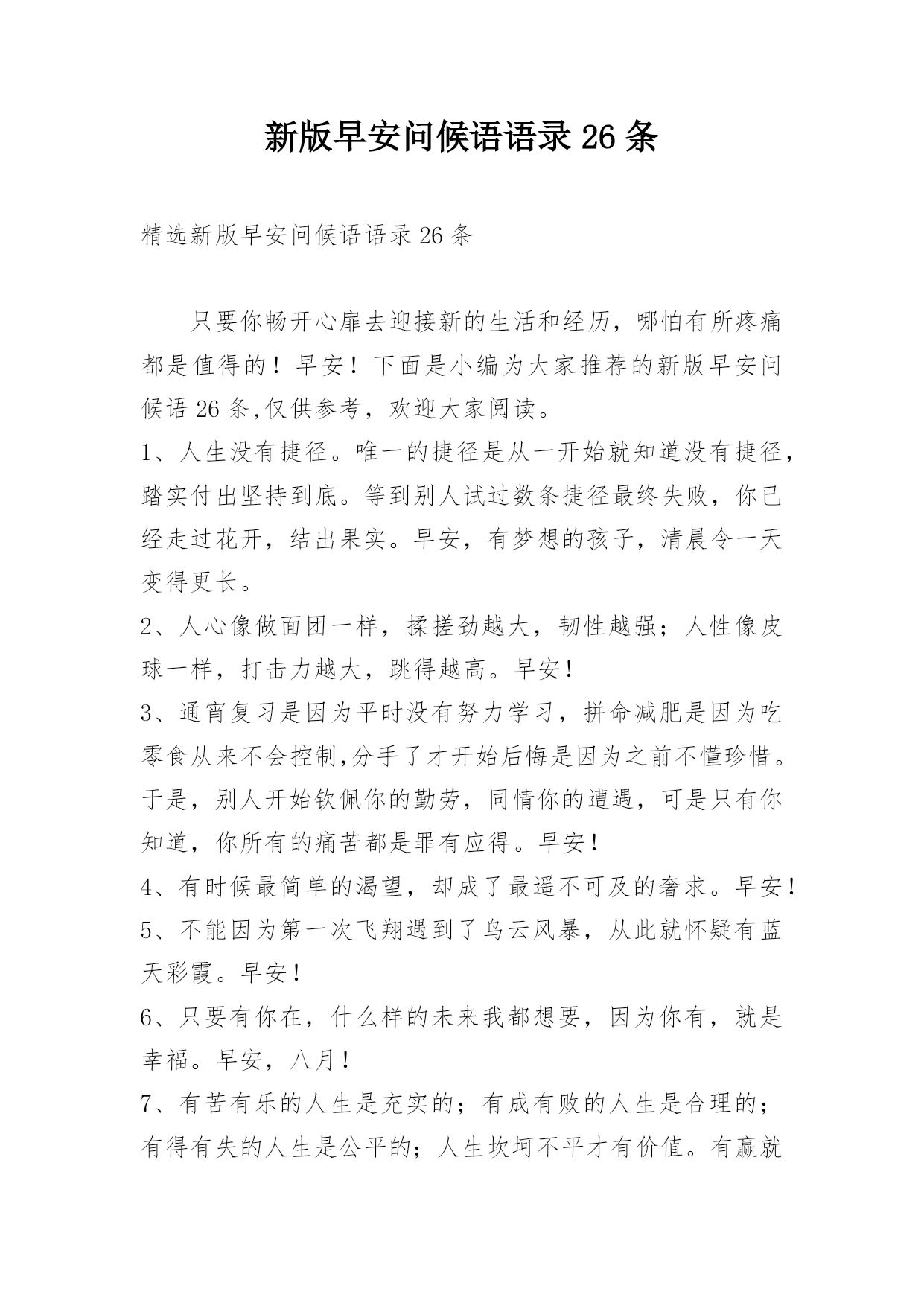 新版早安问候语语录26条精选新版早安问候语语录26条只要你畅开心扉去迎接新的生活和经历,哪怕有所疼痛都是值得的!早安!下面是小编为大家推荐的新版早安问候语26条,仅供参考,欢迎大家阅读。1、人生没有捷径。唯一的捷径是从一开始就知道没有捷径,踏实付出坚持到底。等到别人试过数条捷径最终失败,你已经走过花开,结出果实。早安,有梦想的孩子,清晨令一天变得更长。2、人心像做面团一样,揉搓劲越大,韧性越强;人性像皮球一样,打击力越大,跳得越高。早安!3、通宵复习是因为平时没有努力学习,拼命减肥是因为吃零食从来不会控制