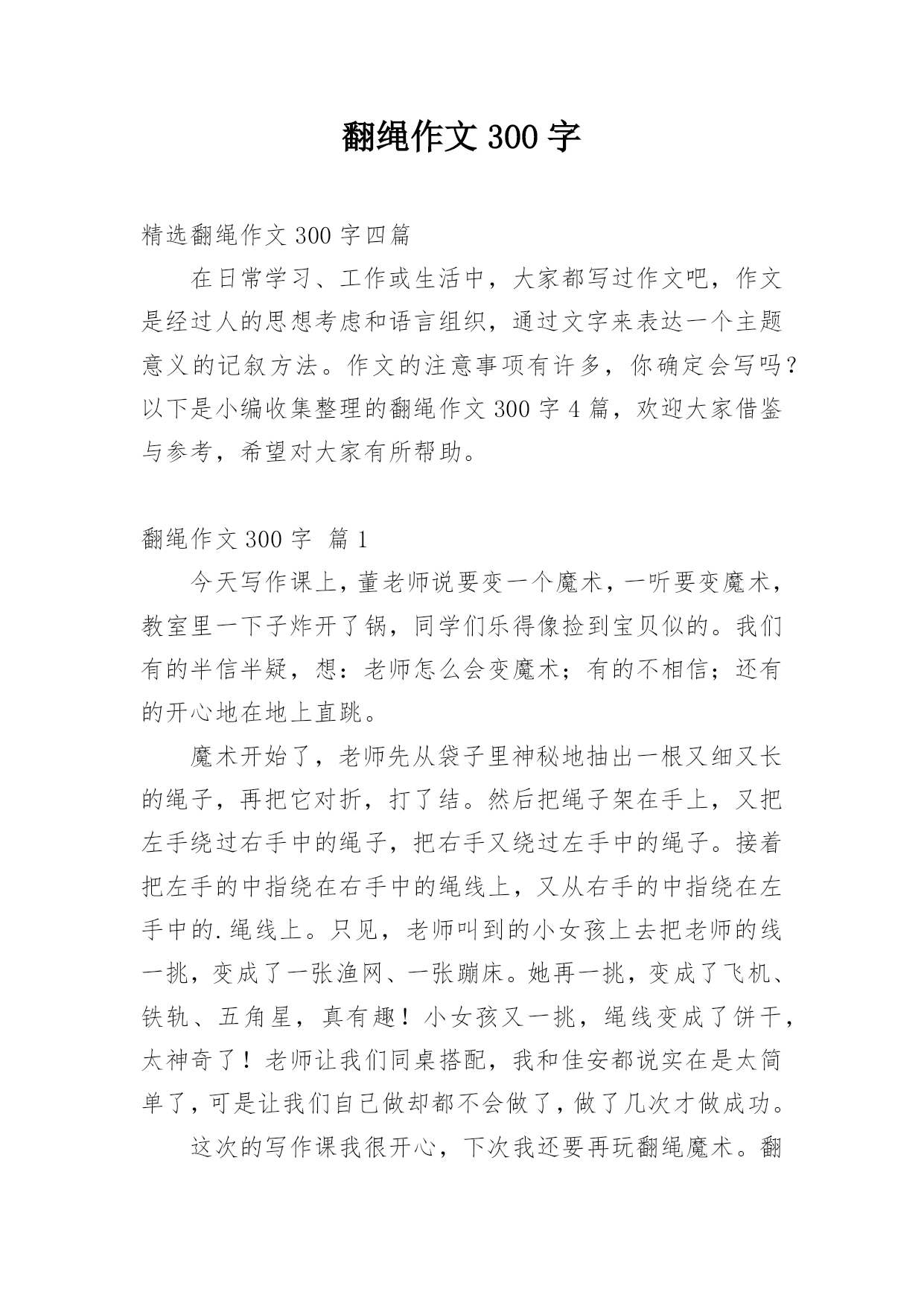 翻绳作文300字精选翻绳作文300字四篇在日常学习、工作或生活中,大家都写过作文吧,作文是经过人的思想考虑和语言组织,通过文字来表达一个主题意义的记叙方法。作文的注意事项有许多,你确定会写吗?以下是小编收集整理的翻绳作文300字4篇,欢迎大家借鉴与参考,希望对大家有所帮助。翻绳作文300字篇1今天写作课上,董老师说要变一个魔术,一听要变魔术,教室里一下子炸开了锅,同学们乐得像捡到宝贝似的。我们有的半信半疑,想:老师怎么会变魔术;有的不相信;还有的开心地在地上直跳。魔术开始了,老师先从袋子里神秘地抽出一根又