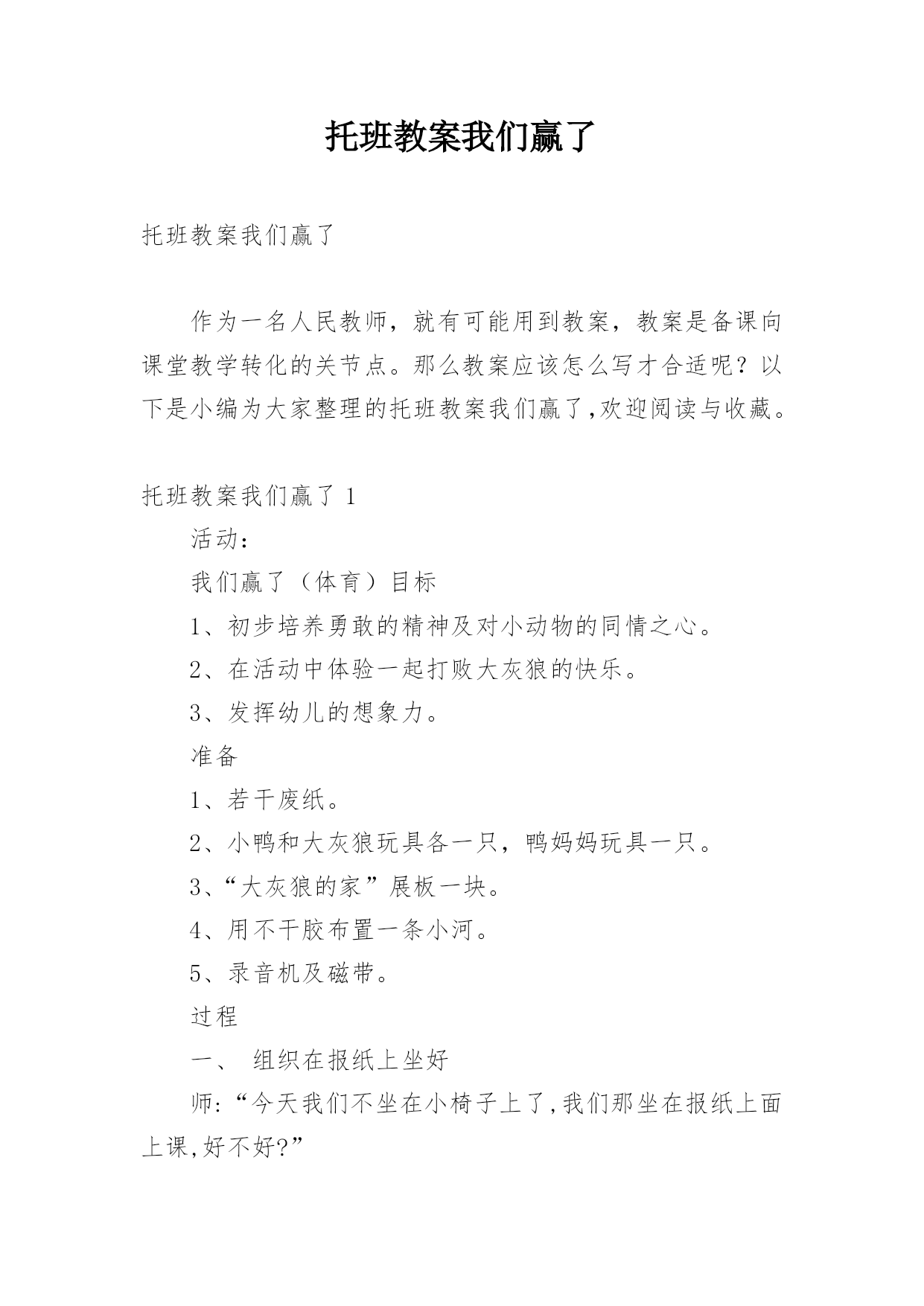 托班教案我们赢了托班教案我们赢了作为一名人民教师,就有可能用到教案,教案是备课向课堂教学转化的关节点。那么教案应该怎么写才合适呢?以下是小编为大家整理的托班教案我们赢了,欢迎阅读与收藏。托班教案我们赢了1活动:我们赢了(体育)目标1、初步培养勇敢的精神及对小动物的同情之心。2、在活动中体验一起打败大灰狼的快乐。3、发挥幼儿的想象力。准备1、若干废纸。2、小鸭和大灰狼玩具各一只,鸭妈妈玩具一只。3、“大灰狼的家”展板一块。4、用不干胶布置一条小河。5、录音机及磁带。过程一、组织在报纸上坐好师:“今天我们不坐