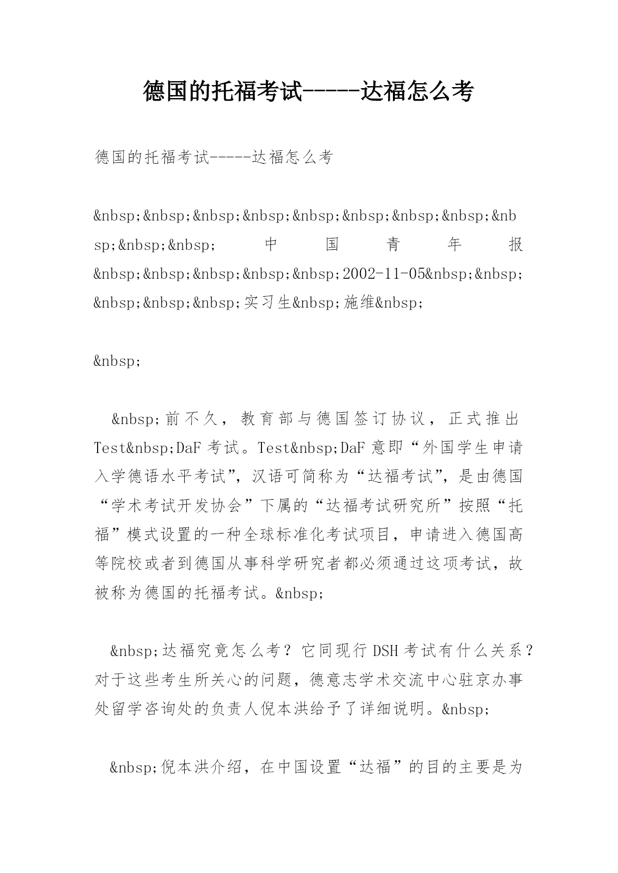 德国的托福考试-----达福怎么考德国的托福考试-----达福怎么考 中国青年报 2002-11-05 实习生 施维 前不久,教育部与德国签订协议,正式推出Test DaF考试。Test DaF意即“