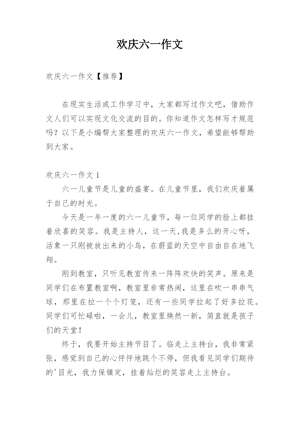 欢庆六一作文欢庆六一作文【推荐】在现实生活或工作学习中,大家都写过作文吧,借助作文人们可以实现文化交流的目的。你知道作文怎样写才规范吗?以下是小编帮大家整理的欢庆六一作文,希望能够帮助到大家。欢庆六一作文1六一儿童节是儿童的盛宴。在儿童节里,我们欢庆着属于自己的时光。今天是一年一度的六一儿童节,每一位同学的脸上都挂着欣喜的笑容。我是主持人,这一天,我是多么的开心呀,活象一只刚被放出来的小鸟,在蔚蓝的天空中自由自在地飞翔。刚到教室,只听见教室传来一阵阵欢快的笑声。原来是同学们在布置教室啊,教室里非常热闹,这