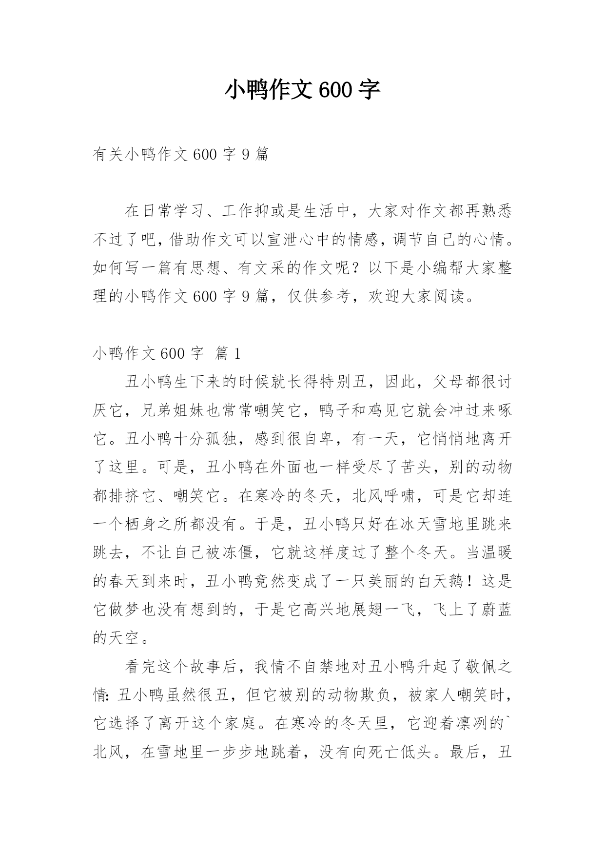 小鸭作文600字有关小鸭作文600字9篇在日常学习、工作抑或是生活中,大家对作文都再熟悉不过了吧,借助作文可以宣泄心中的情感,调节自己的心情。如何写一篇有思想、有文采的作文呢?以下是小编帮大家整理的小鸭作文600字9篇,仅供参考,欢迎大家阅读。小鸭作文600字篇1丑小鸭生下来的时候就长得特别丑,因此,父母都很讨厌它,兄弟姐妹也常常嘲笑它,鸭子和鸡见它就会冲过来啄它。丑小鸭十分孤独,感到很自卑,有一天,它悄悄地离开了这里。可是,丑小鸭在外面也一样受尽了苦头,别的动物都排挤它、嘲笑它。在寒冷的冬天,北风呼啸,