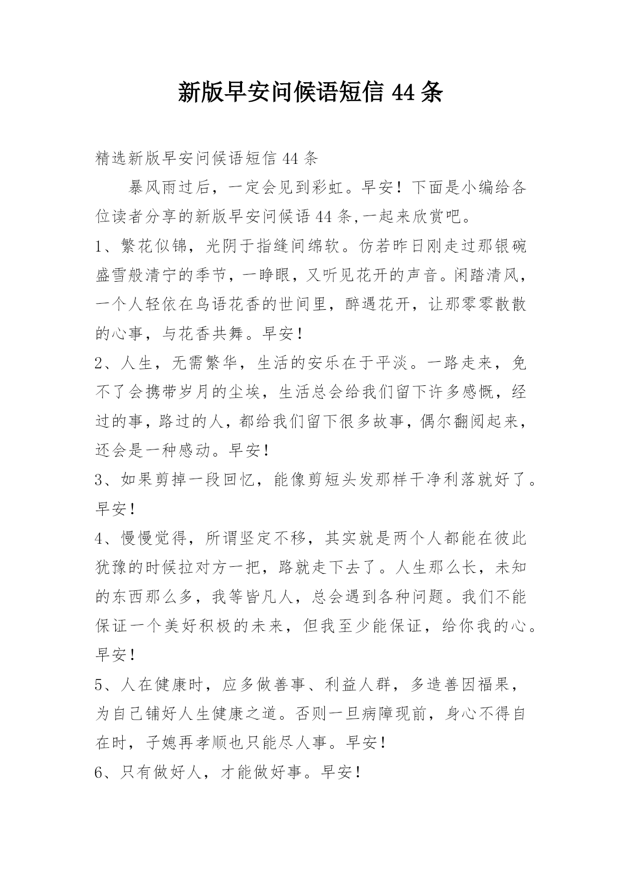 新版早安问候语短信44条精选新版早安问候语短信44条暴风雨过后,一定会见到彩虹。早安!下面是小编给各位读者分享的新版早安问候语44条,一起来欣赏吧。1、繁花似锦,光阴于指缝间绵软。仿若昨日刚走过那银碗盛雪般清宁的季节,一睁眼,又听见花开的声音。闲踏清风,一个人轻依在鸟语花香的世间里,醉遇花开,让那零零散散的心事,与花香共舞。早安!2、人生,无需繁华,生活的安乐在于平淡。一路走来,免不了会携带岁月的尘埃,生活总会给我们留下许多感慨,经过的事,路过的人,都给我们留下很多故事,偶尔翻阅起来,还会是一种感动。早安