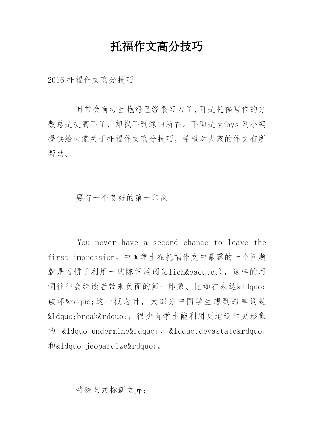 托福作文高分技巧2016托福作文高分技巧时常会有考生抱怨已经很努力了,可是托福写作的分数总是提高不了,却找不到缘由所在。下面是yjbys网小编提供给大家关于托福作文高分技巧,希望对大家的作文有所帮助。要有一个良好的第一印象Youneverhaveasecondchancetoleavethefirstimpression。中国学生在托福作文中暴露的一个问题就是习惯于利用一些陈词滥调(cliché),这样的用词往往会给读者带来负面的第一印象。比如在表达“破坏”这一概念时