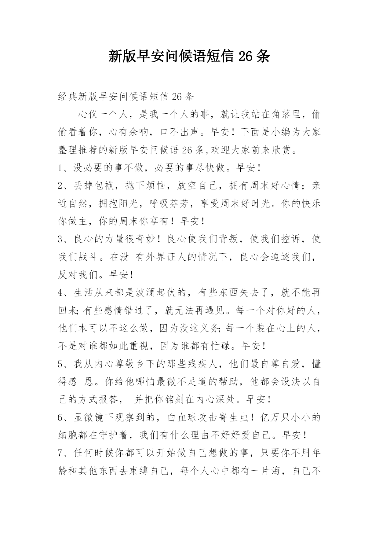 新版早安问候语短信26条经典新版早安问候语短信26条心仪一个人,是我一个人的事,就让我站在角落里,偷偷看着你,心有余响,口不出声。早安!下面是小编为大家整理推荐的新版早安问候语26条,欢迎大家前来欣赏。1、没必要的事不做,必要的事尽快做。早安!2、丢掉包袱,抛下烦恼,放空自己,拥有周末好心情;亲近自然,拥抱阳光,呼吸芬芳,享受周末好时光。你的快乐你做主,你的周末你享有!早安!3、良心的力量很奇妙!良心使我们背叛,使我们控诉,使我们战斗。在没有外界证人的情况下,良心会追逐我们,反对我们。早安!4、生活从来都