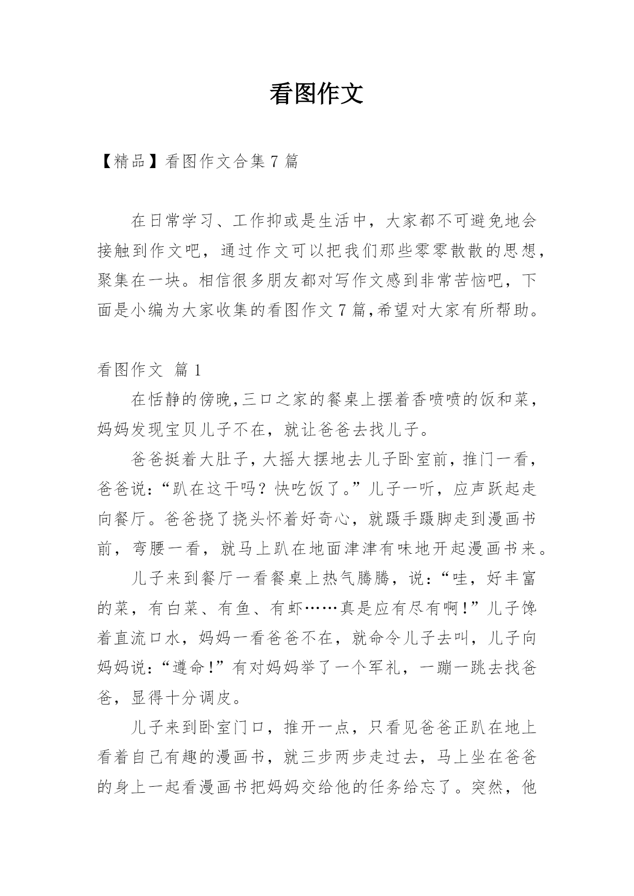看图作文【精品】看图作文合集7篇在日常学习、工作抑或是生活中,大家都不可避免地会接触到作文吧,通过作文可以把我们那些零零散散的思想,聚集在一块。相信很多朋友都对写作文感到非常苦恼吧,下面是小编为大家收集的看图作文7篇,希望对大家有所帮助。看图作文篇1在恬静的傍晚,三口之家的餐桌上摆着香喷喷的饭和菜,妈妈发现宝贝儿子不在,就让爸爸去找儿子。爸爸挺着大肚子,大摇大摆地去儿子卧室前,推门一看,爸爸说:“趴在这干吗?快吃饭了。”儿子一听,应声跃起走向餐厅。爸爸挠了挠头怀着好奇心,就蹑手蹑脚走到漫画书前,弯腰一看,