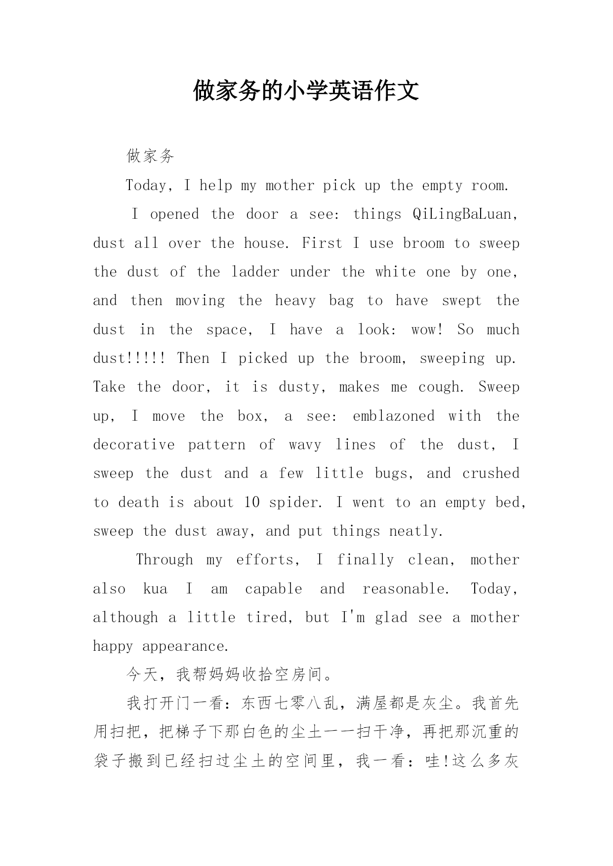 做家务的小学英语作文做家务Today,Ihelpmymotherpickuptheemptyroom.Iopenedthedoorasee:thingsQiLingBaLuan,dustalloverthehouse.FirstIusebroomtosweepthedustoftheladderunderthewhiteonebyone,andthenmovingtheheavybagtohavesweptthedustinthespace,Ihavealook:wow!Somuchdust!!!!!Th