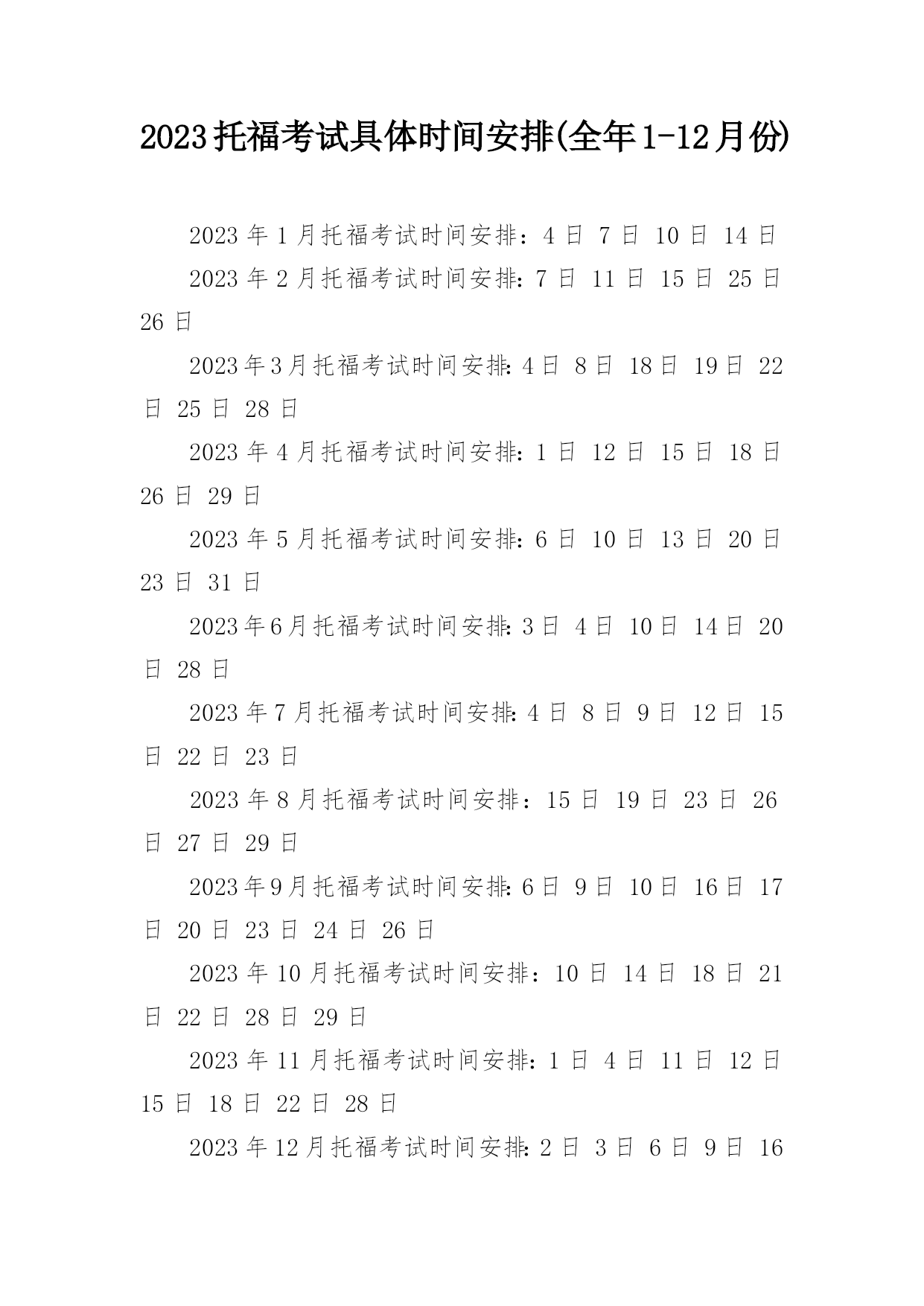 2023托福考试具体时间安排(全年1-12月份)2023年1月托福考试时间安排:4日7日10日14日2023年2月托福考试时间安排:7日11日15日25日26日2023年3月托福考试时间安排:4日8日18日19日22日25日28日2023年4月托福考试时间安排:1日12日15日18日26日29日2023年5月托福考试时间安排:6日10日13日20日23日31日2023年6月托福考试时间安排:3日4日10日14日20日28日2023年7月托福考试时间安排:4日8日9日12日15日22日23日2023年8月托