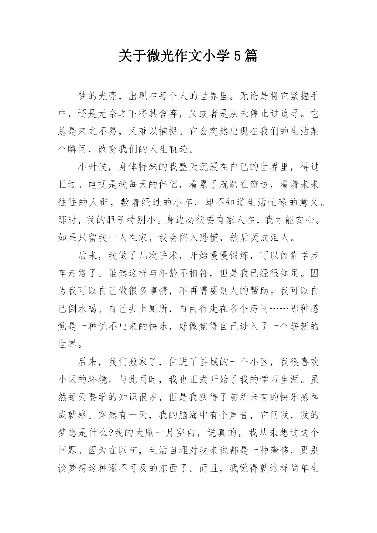 关于微光作文小学5篇梦的光亮,出现在每个人的世界里。无论是将它紧握手中,还是无奈之下将其舍弃,又或者是从未停止过追寻。它总是来之不易,又难以捕捉。它会突然出现在我们的生活某个瞬间,改变我们的人生轨迹。小时候,身体特殊的我整天沉浸在自己的世界里,得过且过。电视是我每天的伴侣,看累了就趴在窗边,看着来来往往的人群,数着经过的小车,却不知道生活忙碌的意义。那时,我的胆子特别小。身边必须要有家人在,我才能安心。如果只留我一人在家,我会陷入恐慌,然后哭成泪人。后来,我做了几次手术,开始慢慢锻炼,可以依靠学步车走路了