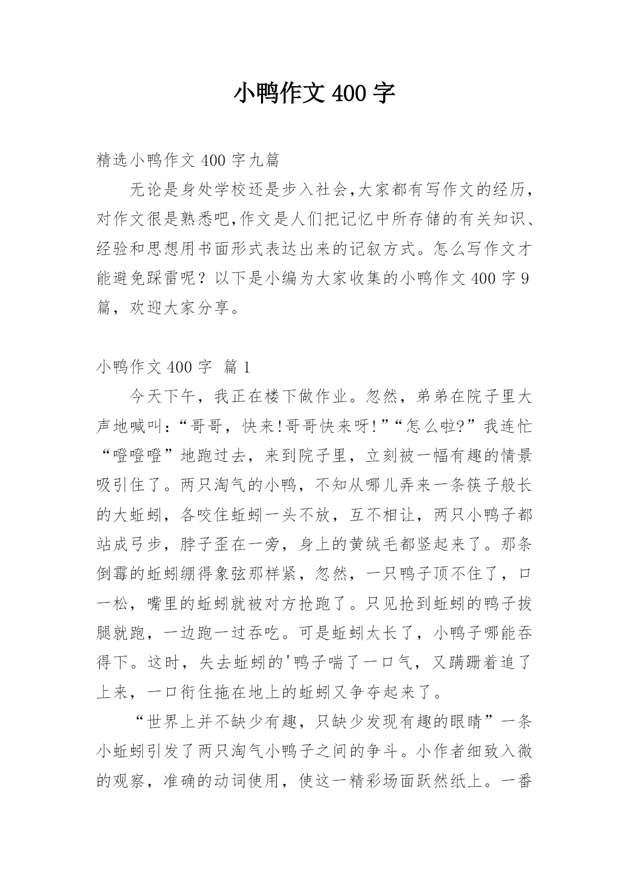 小鸭作文400字精选小鸭作文400字九篇无论是身处学校还是步入社会,大家都有写作文的经历,对作文很是熟悉吧,作文是人们把记忆中所存储的有关知识、经验和思想用书面形式表达出来的记叙方式。怎么写作文才能避免踩雷呢?以下是小编为大家收集的小鸭作文400字9篇,欢迎大家分享。小鸭作文400字篇1今天下午,我正在楼下做作业。忽然,弟弟在院子里大声地喊叫:“哥哥,快来!哥哥快来呀!”“怎么啦?”我连忙“噔噔噔”地跑过去,来到院子里,立刻被一幅有趣的情景吸引住了。两只淘气的小鸭,不知从哪儿弄来一条筷子般长的大蚯蚓,各咬