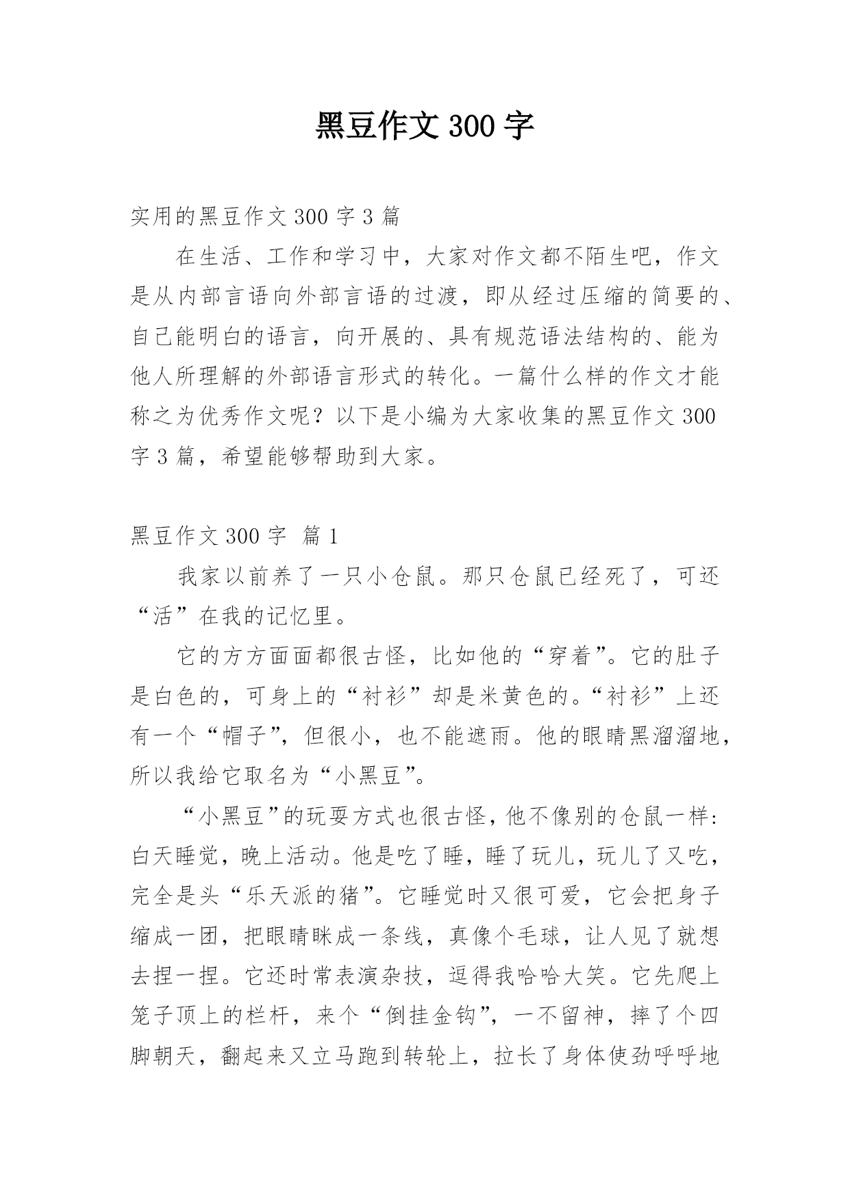 黑豆作文300字实用的黑豆作文300字3篇在生活、工作和学习中,大家对作文都不陌生吧,作文是从内部言语向外部言语的过渡,即从经过压缩的简要的、自己能明白的语言,向开展的、具有规范语法结构的、能为他人所理解的外部语言形式的转化。一篇什么样的作文才能称之为优秀作文呢?以下是小编为大家收集的黑豆作文300字3篇,希望能够帮助到大家。黑豆作文300字篇1我家以前养了一只小仓鼠。那只仓鼠已经死了,可还“活”在我的记忆里。它的方方面面都很古怪,比如他的“穿着”。它的肚子是白色的,可身上的“衬衫”却是米黄色的。“衬衫”