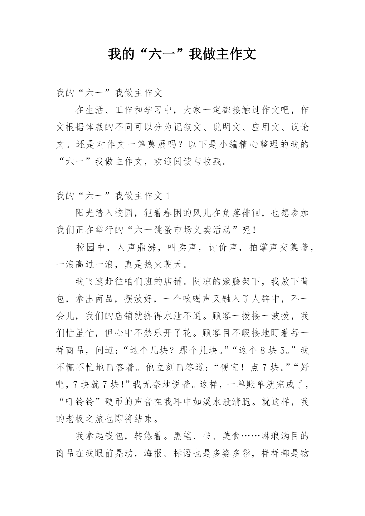我的“六一”我做主作文我的“六一”我做主作文在生活、工作和学习中,大家一定都接触过作文吧,作文根据体裁的不同可以分为记叙文、说明文、应用文、议论文。还是对作文一筹莫展吗?以下是小编精心整理的我的“六一”我做主作文,欢迎阅读与收藏。我的“六一”我做主作文1阳光踏入校园,犯着春困的风儿在角落徘徊,也想参加我们正在举行的“六一跳蚤市场义卖活动”呢!校园中,人声鼎沸,叫卖声,讨价声,拍掌声交集着,一浪高过一浪,真是热火朝天。我飞速赶往咱们班的店铺。阴凉的紫藤架下,我放下背包,拿出商品,摆放好,一个吆喝声又融入了人