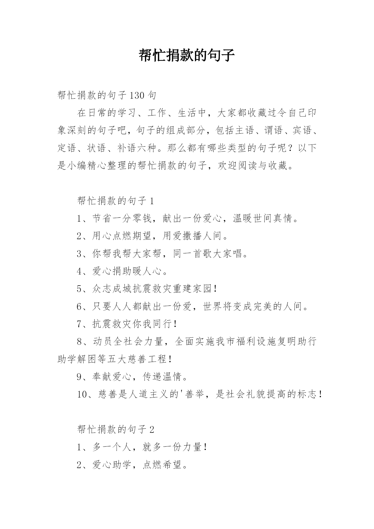 帮忙捐款的句子帮忙捐款的句子130句在日常的学习、工作、生活中,大家都收藏过令自己印象深刻的句子吧,句子的组成部分,包括主语、谓语、宾语、定语、状语、补语六种。那么都有哪些类型的句子呢?以下是小编精心整理的帮忙捐款的句子,欢迎阅读与收藏。帮忙捐款的句子11、节省一分零钱,献出一份爱心,温暖世间真情。2、用心点燃期望,用爱撒播人间。3、你帮我帮大家帮,同一首歌大家唱。4、爱心捐助暖人心。5、众志成城抗震救灾重建家园!6、只要人人都献出一份爱,世界将变成完美的人间。7、抗震救灾你我同行!8、动员全社会力量,全