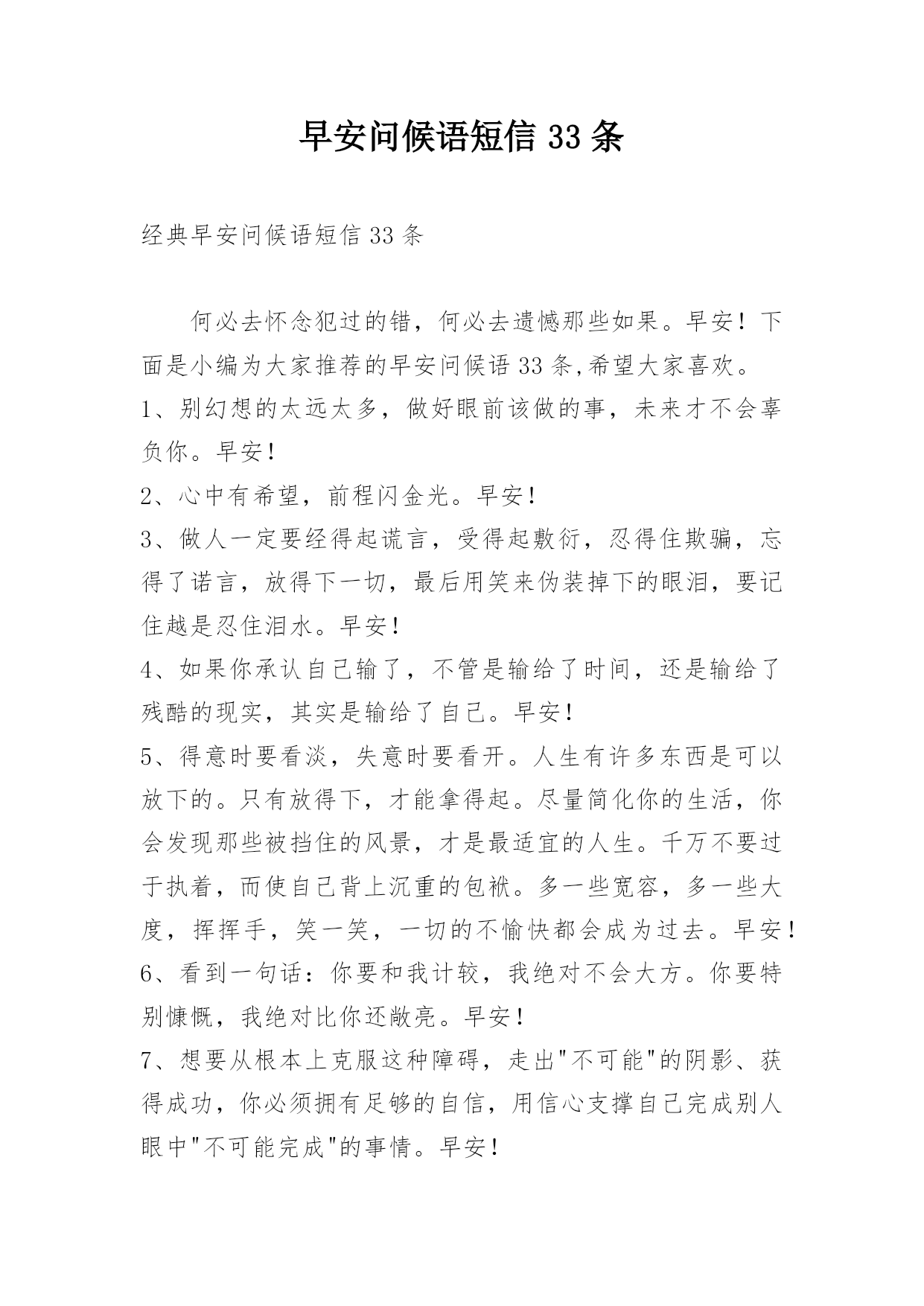早安问候语短信33条经典早安问候语短信33条何必去怀念犯过的错,何必去遗憾那些如果。早安!下面是小编为大家推荐的早安问候语33条,希望大家喜欢。1、别幻想的太远太多,做好眼前该做的事,未来才不会辜负你。早安!2、心中有希望,前程闪金光。早安!3、做人一定要经得起谎言,受得起敷衍,忍得住欺骗,忘得了诺言,放得下一切,最后用笑来伪装掉下的眼泪,要记住越是忍住泪水。早安!4、如果你承认自己输了,不管是输给了时间,还是输给了残酷的现实,其实是输给了自己。早安!5、得意时要看淡,失意时要看开。人生有许多东西是可以放