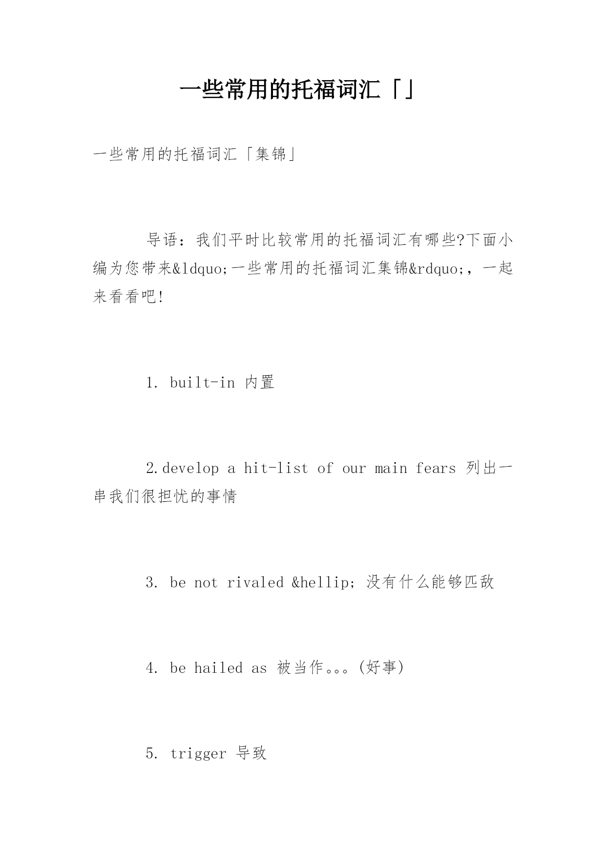 一些常用的托福词汇「」一些常用的托福词汇「集锦」导语:我们平时比较常用的托福词汇有哪些?下面小编为您带来“一些常用的托福词汇集锦”,一起来看看吧!1.built-in内置2.developahit-listofourmainfears列出一串我们很担忧的事情3.benotrivaled…没有什么能够匹敌4.behailedas被当作。。。(好事)5.trigger导致6.afringeof一小部分7.discrepancy差异8.amountto攀升9.inclina