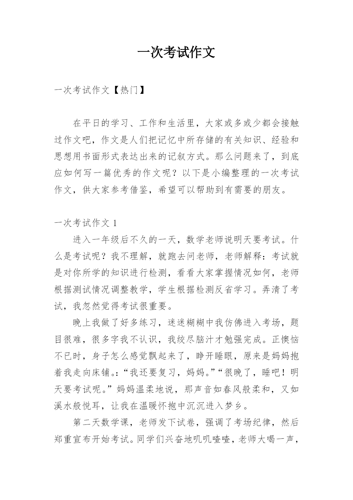一次考试作文一次考试作文【热门】在平日的学习、工作和生活里,大家或多或少都会接触过作文吧,作文是人们把记忆中所存储的有关知识、经验和思想用书面形式表达出来的记叙方式。那么问题来了,到底应如何写一篇优秀的作文呢?以下是小编整理的一次考试作文,供大家参考借鉴,希望可以帮助到有需要的朋友。一次考试作文1进入一年级后不久的一天,数学老师说明天要考试。什么是考试呢?我不理解,就跑去问老师,老师解释:考试就是对你所学的知识进行检测,看看大家掌握情况如何,老师根据测试情况调整教学,学生根据检测反省学习。弄清了考试,我忽