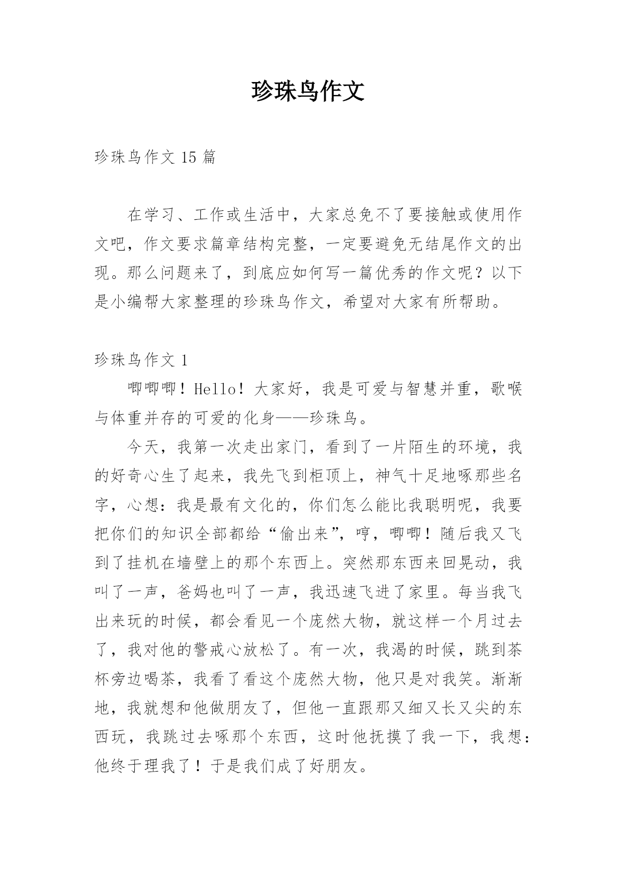 珍珠鸟作文珍珠鸟作文15篇在学习、工作或生活中,大家总免不了要接触或使用作文吧,作文要求篇章结构完整,一定要避免无结尾作文的出现。那么问题来了,到底应如何写一篇优秀的作文呢?以下是小编帮大家整理的珍珠鸟作文,希望对大家有所帮助。珍珠鸟作文1唧唧唧!Hello!大家好,我是可爱与智慧并重,歌喉与体重并存的可爱的化身——珍珠鸟。今天,我第一次走出家门,看到了一片陌生的环境,我的好奇心生了起来,我先飞到柜顶上,神气十足地啄那些名字,心想:我是最有文化的,你们怎么能比我聪明呢,我要把你们的知识全部都给“偷出来”,