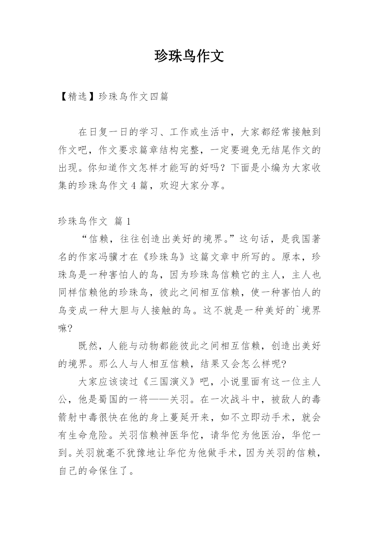 珍珠鸟作文【精选】珍珠鸟作文四篇在日复一日的学习、工作或生活中,大家都经常接触到作文吧,作文要求篇章结构完整,一定要避免无结尾作文的出现。你知道作文怎样才能写的好吗?下面是小编为大家收集的珍珠鸟作文4篇,欢迎大家分享。珍珠鸟作文篇1“信赖,往往创造出美好的境界。”这句话,是我国著名的作家冯骥才在《珍珠鸟》这篇文章中所写的。原本,珍珠鸟是一种害怕人的鸟,因为珍珠鸟信赖它的主人,主人也同样信赖他的珍珠鸟,彼此之间相互信赖,使一种害怕人的鸟变成一种大胆与人接触的鸟。这不就是一种美好的`境界嘛?既然,人能与动物都