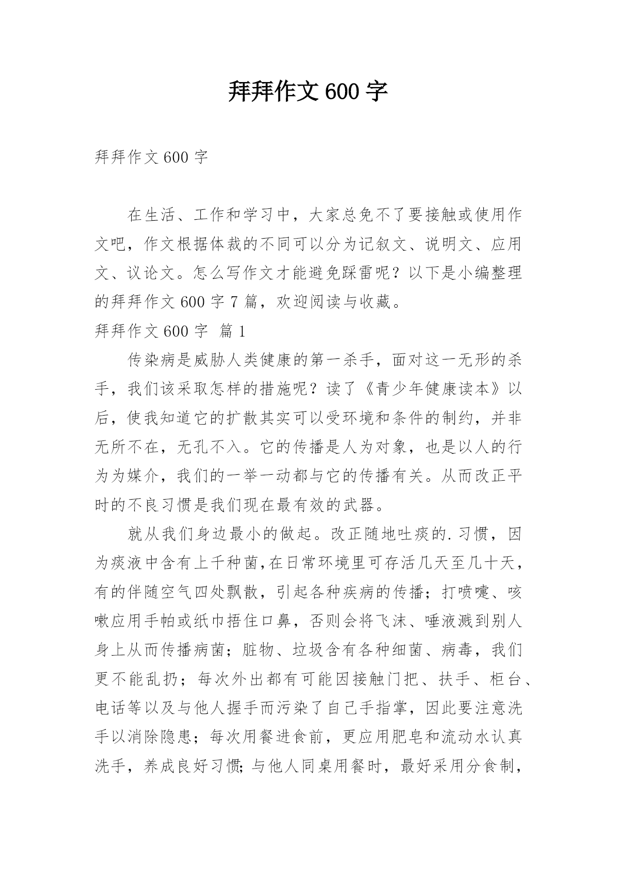 拜拜作文600字拜拜作文600字在生活、工作和学习中,大家总免不了要接触或使用作文吧,作文根据体裁的不同可以分为记叙文、说明文、应用文、议论文。怎么写作文才能避免踩雷呢?以下是小编整理的拜拜作文600字7篇,欢迎阅读与收藏。拜拜作文600字篇1传染病是威胁人类健康的第一杀手,面对这一无形的杀手,我们该采取怎样的措施呢?读了《青少年健康读本》以后,使我知道它的扩散其实可以受环境和条件的制约,并非无所不在,无孔不入。它的传播是人为对象,也是以人的行为为媒介,我们的一举一动都与它的传播有关。从而改正平时的不良习