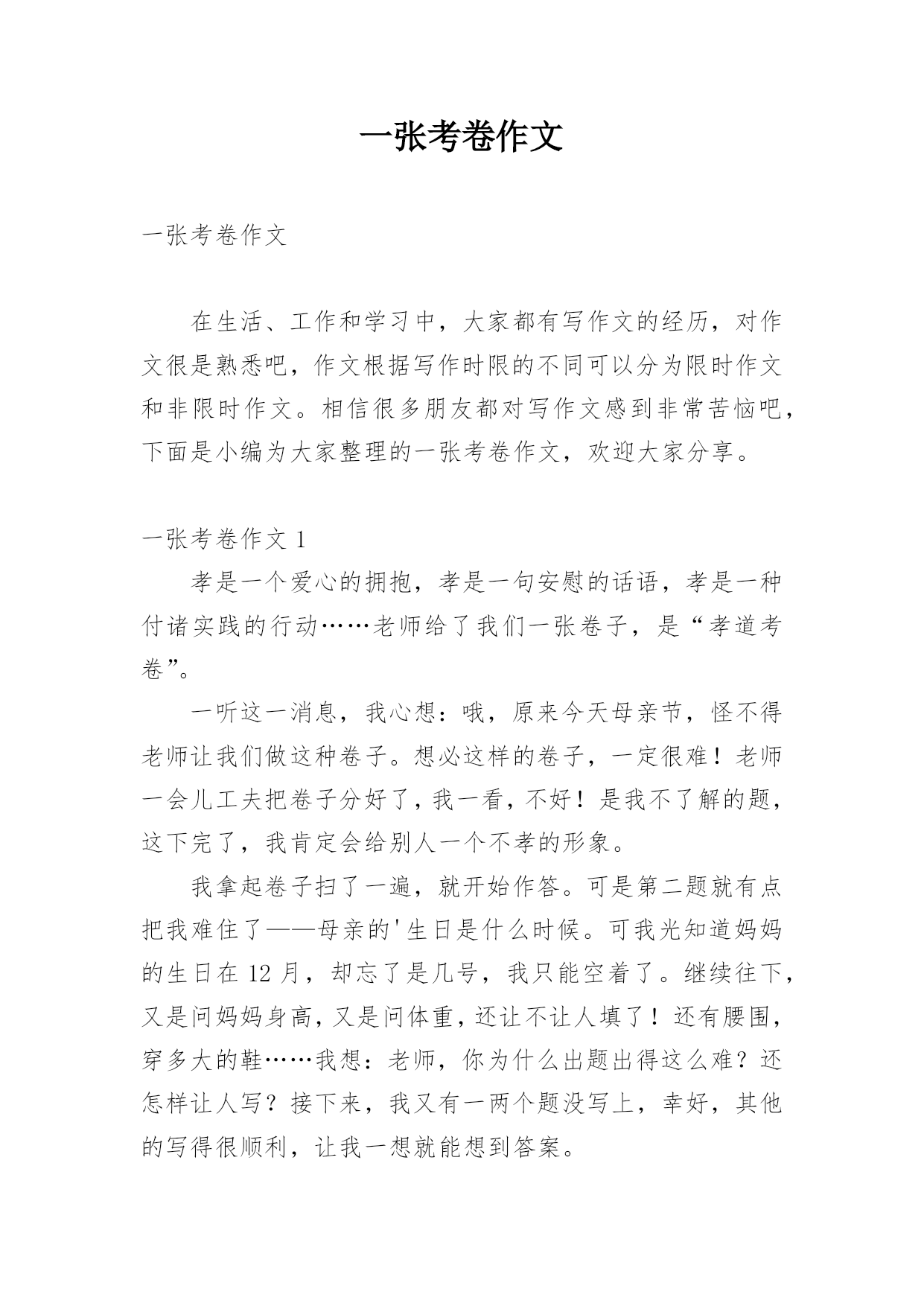 一张考卷作文一张考卷作文在生活、工作和学习中,大家都有写作文的经历,对作文很是熟悉吧,作文根据写作时限的不同可以分为限时作文和非限时作文。相信很多朋友都对写作文感到非常苦恼吧,下面是小编为大家整理的一张考卷作文,欢迎大家分享。一张考卷作文1孝是一个爱心的拥抱,孝是一句安慰的话语,孝是一种付诸实践的行动……老师给了我们一张卷子,是“孝道考卷”。一听这一消息,我心想:哦,原来今天母亲节,怪不得老师让我们做这种卷子。想必这样的卷子,一定很难!老师一会儿工夫把卷子分好了,我一看,不好!是我不了解的题,这下完了,我