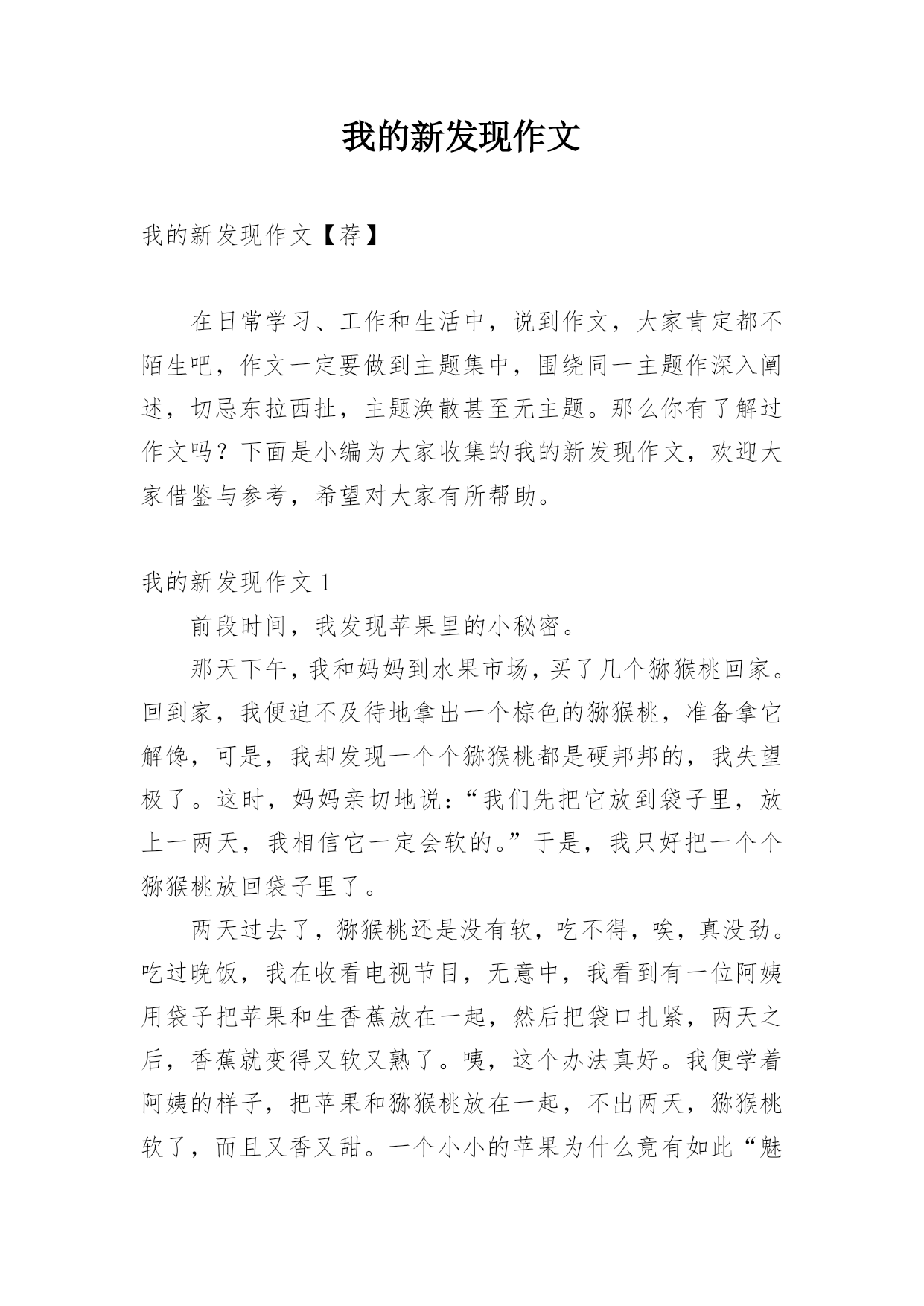 我的新发现作文我的新发现作文【荐】在日常学习、工作和生活中,说到作文,大家肯定都不陌生吧,作文一定要做到主题集中,围绕同一主题作深入阐述,切忌东拉西扯,主题涣散甚至无主题。那么你有了解过作文吗?下面是小编为大家收集的我的新发现作文,欢迎大家借鉴与参考,希望对大家有所帮助。我的新发现作文1前段时间,我发现苹果里的小秘密。那天下午,我和妈妈到水果市场,买了几个猕猴桃回家。回到家,我便迫不及待地拿出一个棕色的猕猴桃,准备拿它解馋,可是,我却发现一个个猕猴桃都是硬邦邦的,我失望极了。这时,妈妈亲切地说:“我们先把