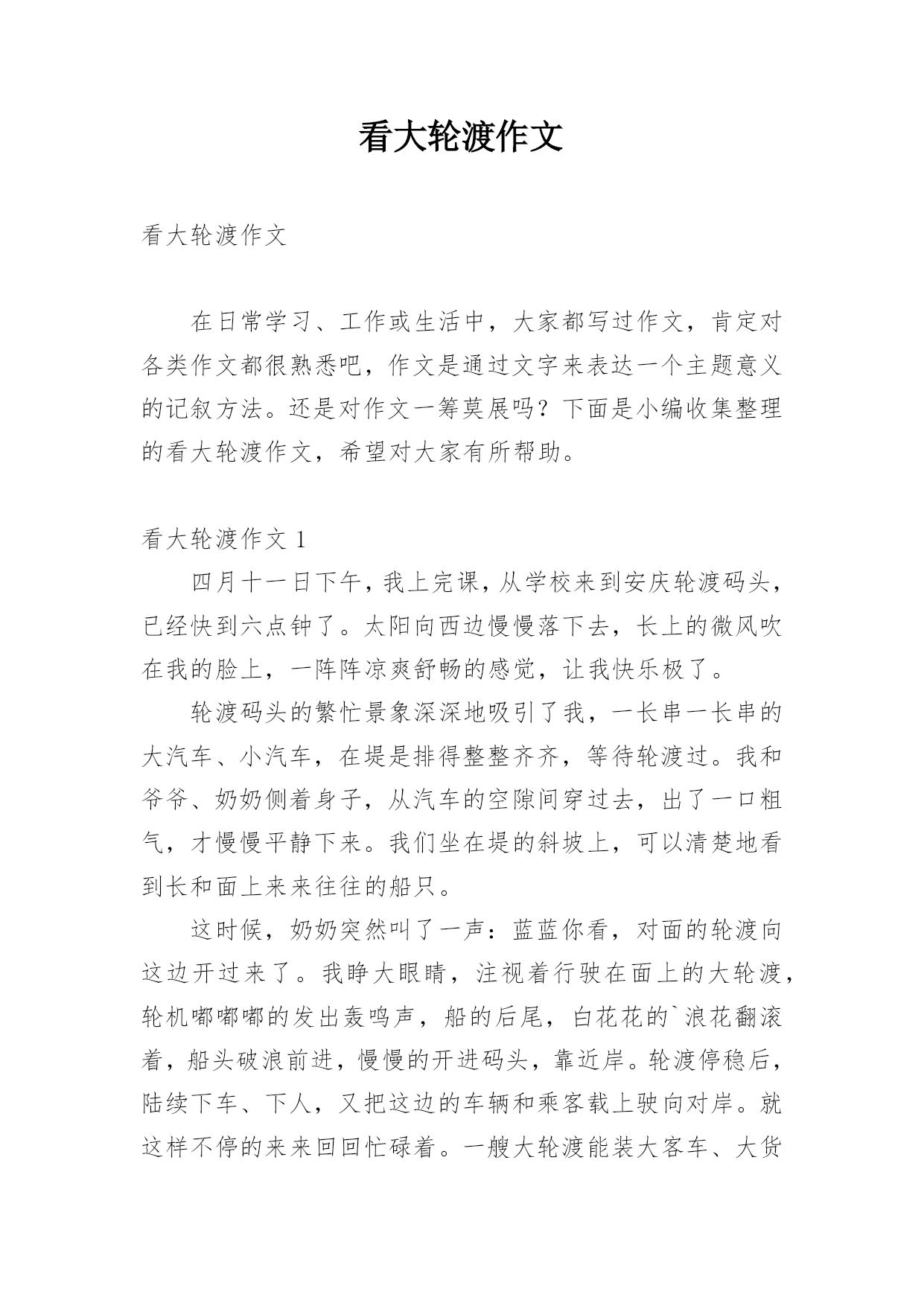 看大轮渡作文看大轮渡作文在日常学习、工作或生活中,大家都写过作文,肯定对各类作文都很熟悉吧,作文是通过文字来表达一个主题意义的记叙方法。还是对作文一筹莫展吗?下面是小编收集整理的看大轮渡作文,希望对大家有所帮助。看大轮渡作文1四月十一日下午,我上完课,从学校来到安庆轮渡码头,已经快到六点钟了。太阳向西边慢慢落下去,长上的微风吹在我的脸上,一阵阵凉爽舒畅的感觉,让我快乐极了。轮渡码头的繁忙景象深深地吸引了我,一长串一长串的大汽车、小汽车,在堤是排得整整齐齐,等待轮渡过。我和爷爷、奶奶侧着身子,从汽车的空隙间