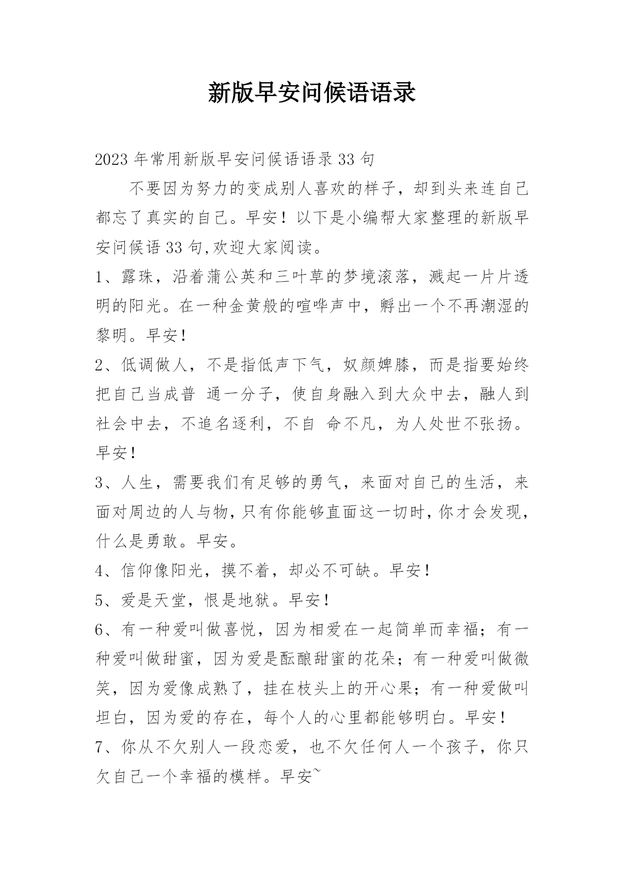 新版早安问候语语录2023年常用新版早安问候语语录33句不要因为努力的变成别人喜欢的样子,却到头来连自己都忘了真实的自己。早安!以下是小编帮大家整理的新版早安问候语33句,欢迎大家阅读。1、露珠,沿着蒲公英和三叶草的梦境滚落,溅起一片片透明的阳光。在一种金黄般的喧哗声中,孵出一个不再潮湿的黎明。早安!2、低调做人,不是指低声下气,奴颜婢膝,而是指要始终把自己当成普通一分子,使自身融入到大众中去,融人到社会中去,不追名逐利,不自命不凡,为人处世不张扬。早安!3、人生,需要我们有足够的勇气,来面对自己的生活,