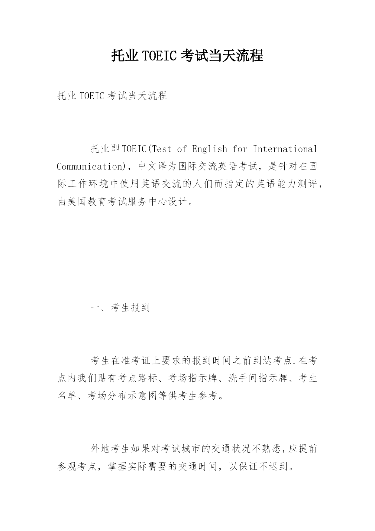 托业TOEIC考试当天流程托业TOEIC考试当天流程托业即TOEIC(TestofEnglishforInternationalCommunication),中文译为国际交流英语考试,是针对在国际工作环境中使用英语交流的人们而指定的英语能力测评,由美国教育考试服务中心设计。一、考生报到考生在准考证上要求的报到时间之前到达考点.在考点内我们贴有考点路标、考场指示牌、洗手间指示牌、考生名单、考场分布示意图等供考生参考。外地考生如果对考试城市的交通状况不熟悉,应提前参观考点,掌握实际需要的交通时间,以保证不迟到