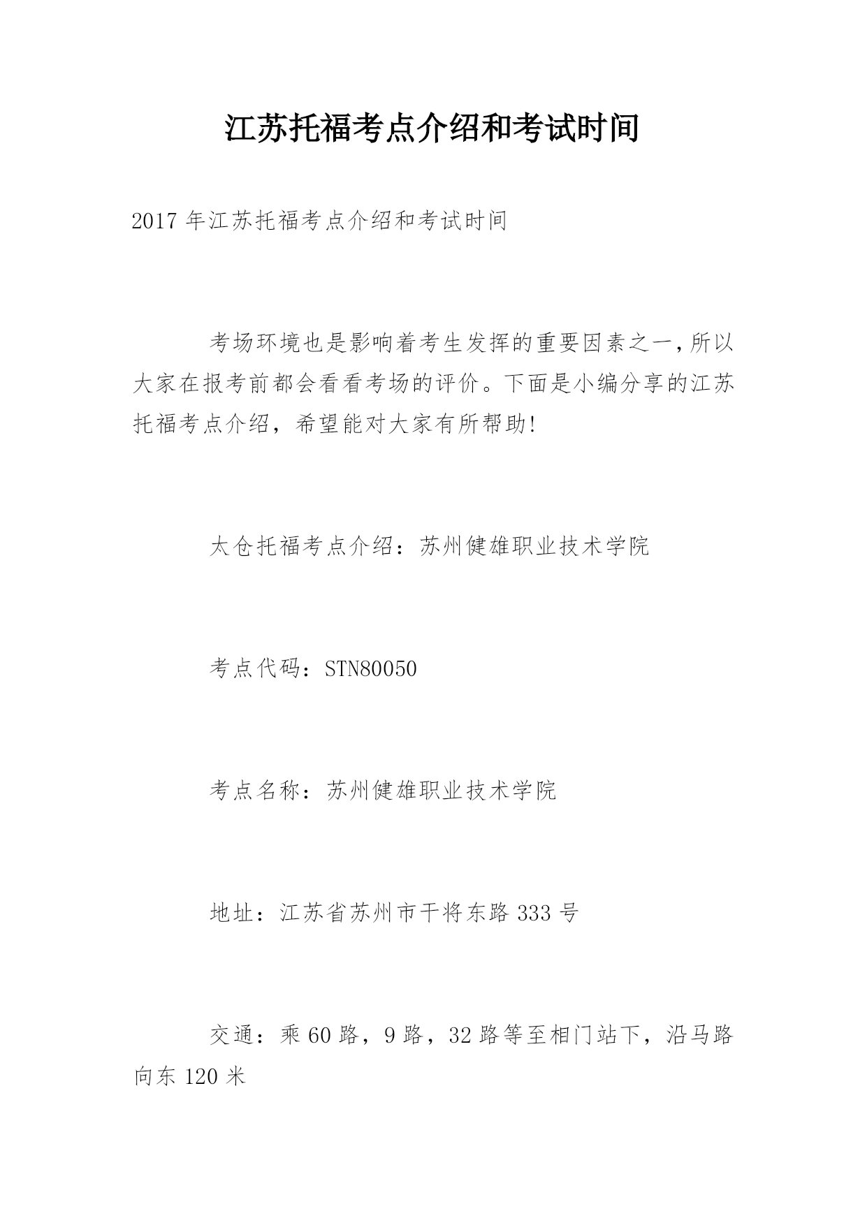江苏托福考点介绍和考试时间2017年江苏托福考点介绍和考试时间考场环境也是影响着考生发挥的重要因素之一,所以大家在报考前都会看看考场的评价。下面是小编分享的江苏托福考点介绍,希望能对大家有所帮助!太仓托福考点介绍:苏州健雄职业技术学院考点代码:STN80050考点名称:苏州健雄职业技术学院地址:江苏省苏州市干将东路333号交通:乘60路,9路,32路等至相门站下,沿马路向东120米太仓托福考点:苏州健雄职业技术学院2016年托福考试时间1月09日,1月23日,1月24日,2月27日,2月28日,3月11日