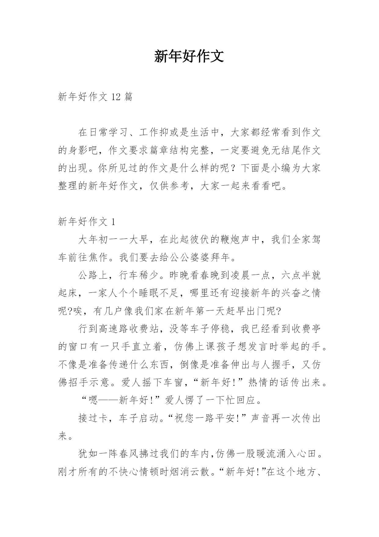 新年好作文新年好作文12篇在日常学习、工作抑或是生活中,大家都经常看到作文的身影吧,作文要求篇章结构完整,一定要避免无结尾作文的出现。你所见过的作文是什么样的呢?下面是小编为大家整理的新年好作文,仅供参考,大家一起来看看吧。新年好作文1大年初一一大早,在此起彼伏的鞭炮声中,我们全家驾车前往焦作。我们要去给公公婆婆拜年。公路上,行车稀少。昨晚看春晚到凌晨一点,六点半就起床,一家人个个睡眠不足,哪里还有迎接新年的兴奋之情呢?唉,有几户像我们家在新年第一天赶早出门呢?行到高速路收费站,没等车子停稳,我已经看到收