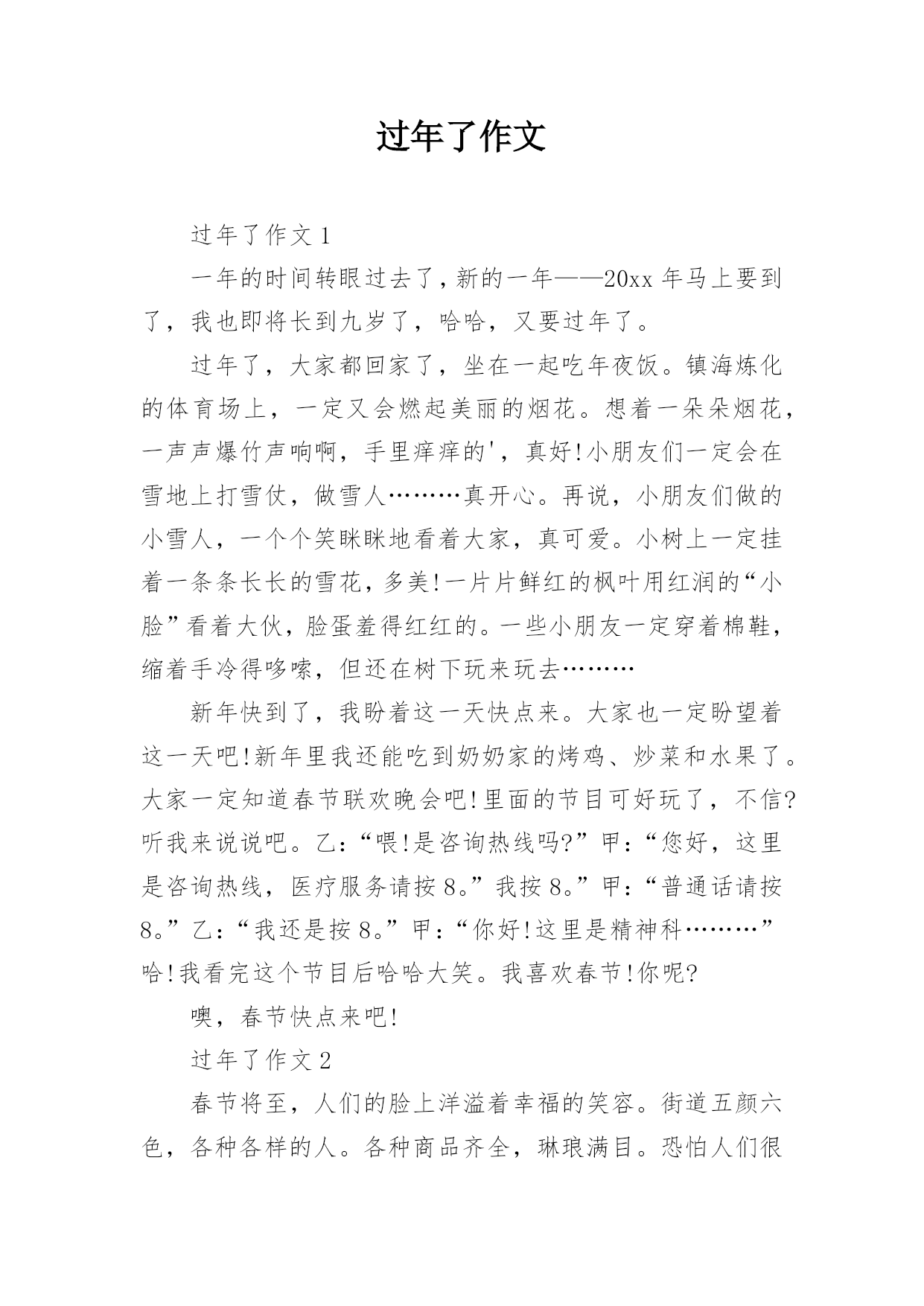 过年了作文过年了作文1一年的时间转眼过去了,新的一年——20xx年马上要到了,我也即将长到九岁了,哈哈,又要过年了。过年了,大家都回家了,坐在一起吃年夜饭。镇海炼化的体育场上,一定又会燃起美丽的烟花。想着一朵朵烟花,一声声爆竹声响啊,手里痒痒的',真好!小朋友们一定会在雪地上打雪仗,做雪人………真开心。再说,小朋友们做的小雪人,一个个笑眯眯地看着大家,真可爱。小树上一定挂着一条条长长的雪花,多美!一片片鲜红的枫叶用红润的“小脸”看着大伙,脸蛋羞得红红的。一些小朋友一定穿着棉鞋,缩着手冷得哆嗦,但还在树下玩