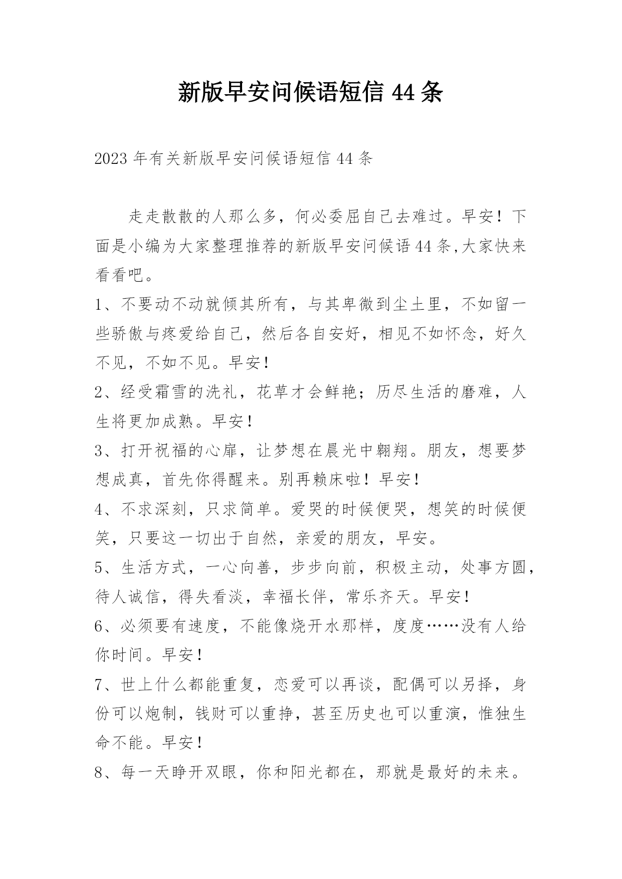 新版早安问候语短信44条2023年有关新版早安问候语短信44条走走散散的人那么多,何必委屈自己去难过。早安!下面是小编为大家整理推荐的新版早安问候语44条,大家快来看看吧。1、不要动不动就倾其所有,与其卑微到尘土里,不如留一些骄傲与疼爱给自己,然后各自安好,相见不如怀念,好久不见,不如不见。早安!2、经受霜雪的洗礼,花草才会鲜艳;历尽生活的磨难,人生将更加成熟。早安!3、打开祝福的心扉,让梦想在晨光中翱翔。朋友,想要梦想成真,首先你得醒来。别再赖床啦!早安!4、不求深刻,只求简单。爱哭的时候便哭,想笑的时