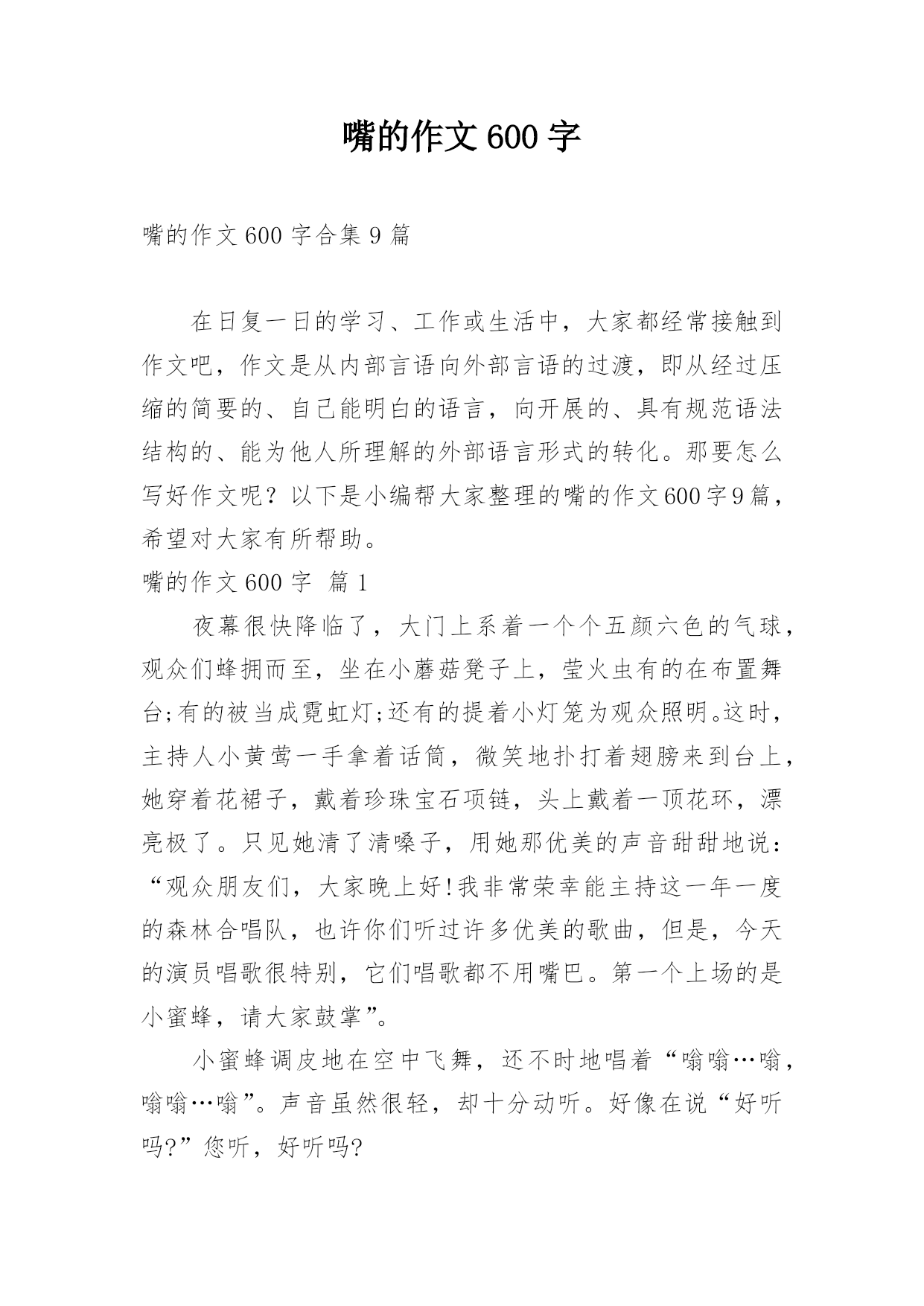 嘴的作文600字嘴的作文600字合集9篇在日复一日的学习、工作或生活中,大家都经常接触到作文吧,作文是从内部言语向外部言语的过渡,即从经过压缩的简要的、自己能明白的语言,向开展的、具有规范语法结构的、能为他人所理解的外部语言形式的转化。那要怎么写好作文呢?以下是小编帮大家整理的嘴的作文600字9篇,希望对大家有所帮助。嘴的作文600字篇1夜幕很快降临了,大门上系着一个个五颜六色的气球,观众们蜂拥而至,坐在小蘑菇凳子上,莹火虫有的在布置舞台;有的被当成霓虹灯;还有的提着小灯笼为观众照明。这时,主持人小黄莺一