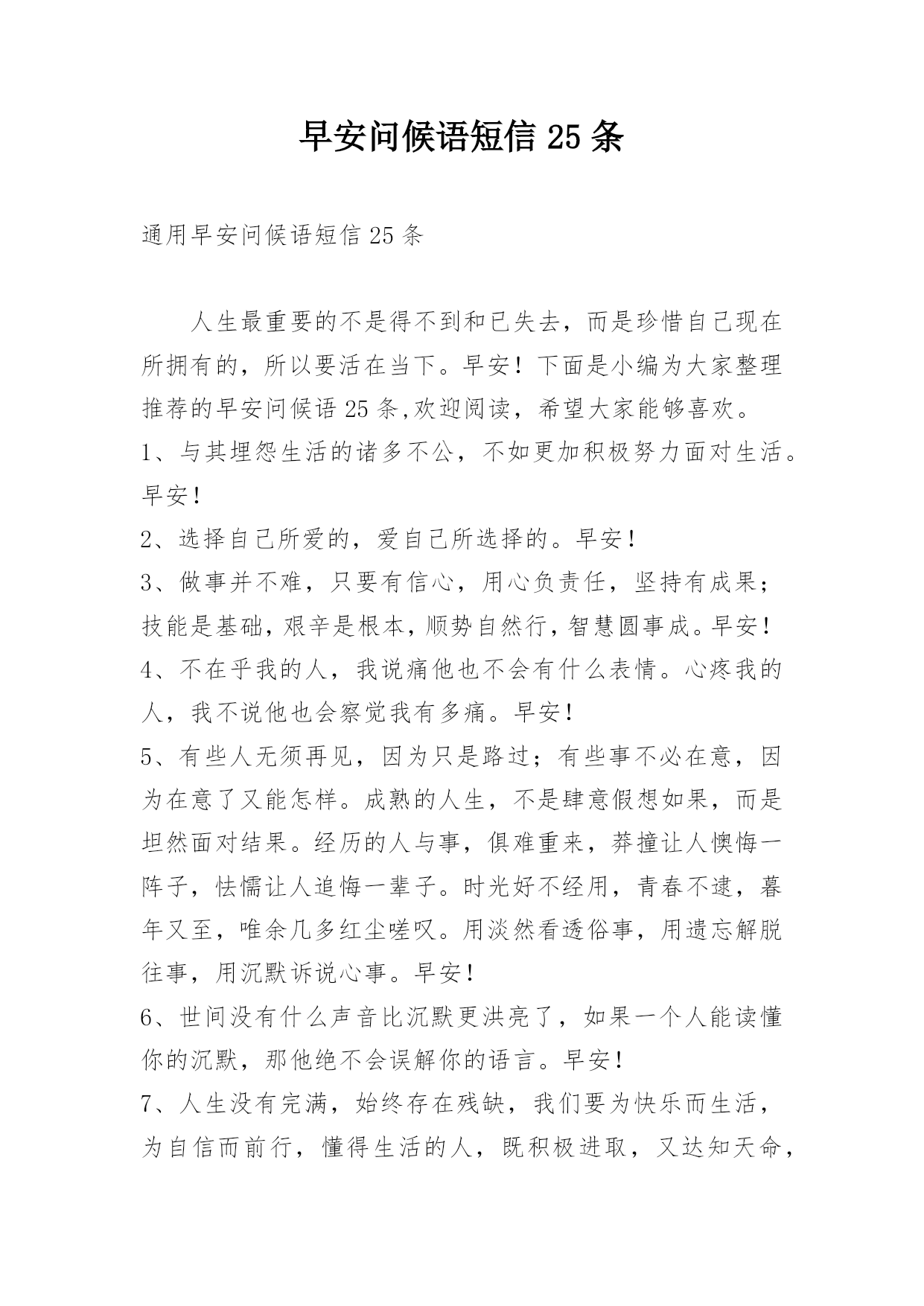 早安问候语短信25条通用早安问候语短信25条人生最重要的不是得不到和已失去,而是珍惜自己现在所拥有的,所以要活在当下。早安!下面是小编为大家整理推荐的早安问候语25条,欢迎阅读,希望大家能够喜欢。1、与其埋怨生活的诸多不公,不如更加积极努力面对生活。早安!2、选择自己所爱的,爱自己所选择的。早安!3、做事并不难,只要有信心,用心负责任,坚持有成果;技能是基础,艰辛是根本,顺势自然行,智慧圆事成。早安!4、不在乎我的人,我说痛他也不会有什么表情。心疼我的人,我不说他也会察觉我有多痛。早安!5、有些人无须再见