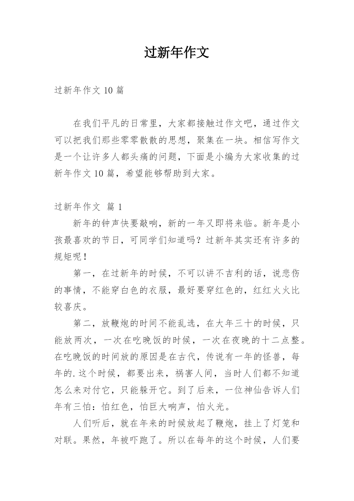 过新年作文过新年作文10篇在我们平凡的日常里,大家都接触过作文吧,通过作文可以把我们那些零零散散的思想,聚集在一块。相信写作文是一个让许多人都头痛的问题,下面是小编为大家收集的过新年作文10篇,希望能够帮助到大家。过新年作文篇1新年的钟声快要敲响,新的一年又即将来临。新年是小孩最喜欢的节日,可同学们知道吗?过新年其实还有许多的规矩呢!第一,在过新年的时候,不可以讲不吉利的话,说悲伤的事情,不能穿白色的衣服,最好要穿红色的,红红火火比较喜庆。第二,放鞭炮的时间不能乱选,在大年三十的时候,只能放两次,一次在吃