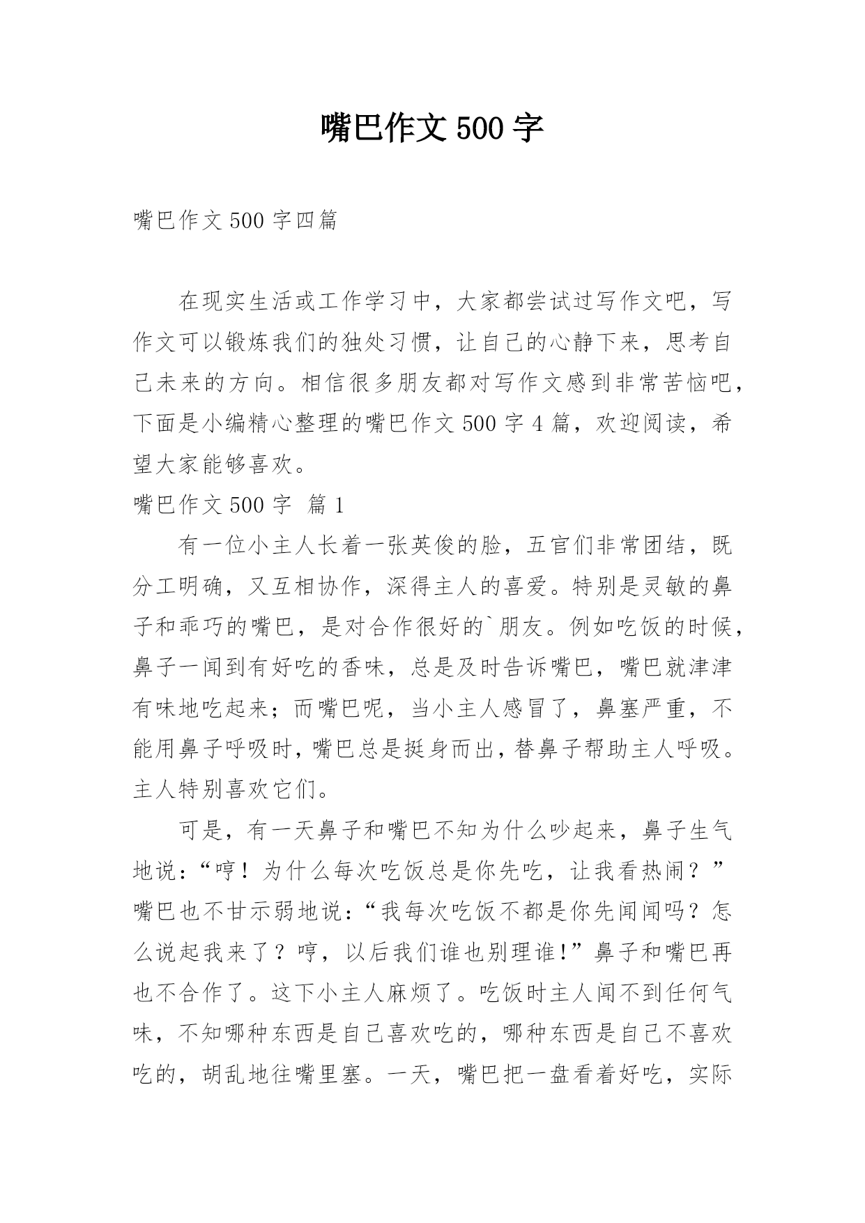 嘴巴作文500字嘴巴作文500字4篇在日常学习、工作和生活中,大家或多或少都会接触过作文吧,作文是从内部言语向外部言语的过渡,即从经过压缩的简要的、自己能明白的语言,向开展的、具有规范语法结构的、能为他人所理解的外部语言形式的转化。作文的注意事项有许多,你确定会写吗?下面是小编帮大家整理的嘴巴作文500字4篇,希望能够帮助到大家。嘴巴作文500字篇1一天,鼻子和嘴巴的小主人过生日,香甜缤纷的奶油蛋糕,可口的饭菜,还有金灿灿的橘汁,真是让人垂涎欲滴啊。小主人和她的朋友们品尝着美味的佳肴,开怀畅饮而有说有笑。