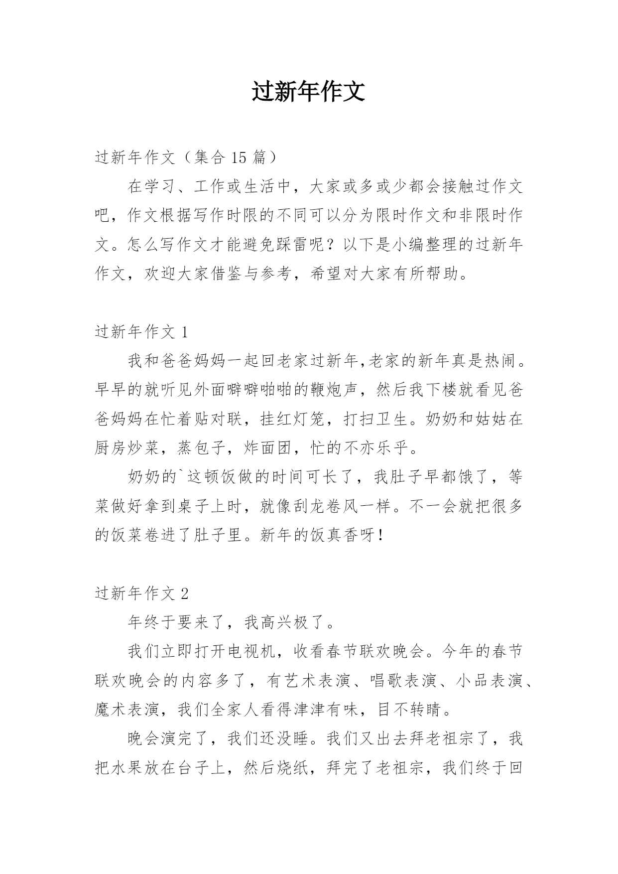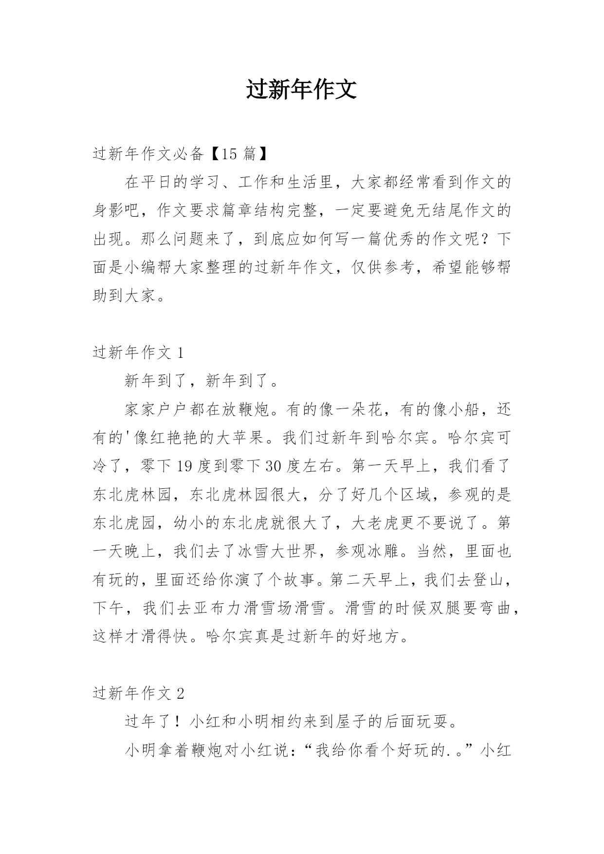 过新年作文过新年作文必备【15篇】在平日的学习、工作和生活里,大家都经常看到作文的身影吧,作文要求篇章结构完整,一定要避免无结尾作文的出现。那么问题来了,到底应如何写一篇优秀的作文呢?下面是小编帮大家整理的过新年作文,仅供参考,希望能够帮助到大家。过新年作文1新年到了,新年到了。家家户户都在放鞭炮。有的像一朵花,有的像小船,还有的'像红艳艳的大苹果。我们过新年到哈尔宾。哈尔宾可冷了,零下19度到零下30度左右。第一天早上,我们看了东北虎林园,东北虎林园很大,分了好几个区域,参观的是东北虎园,幼小的东北虎就