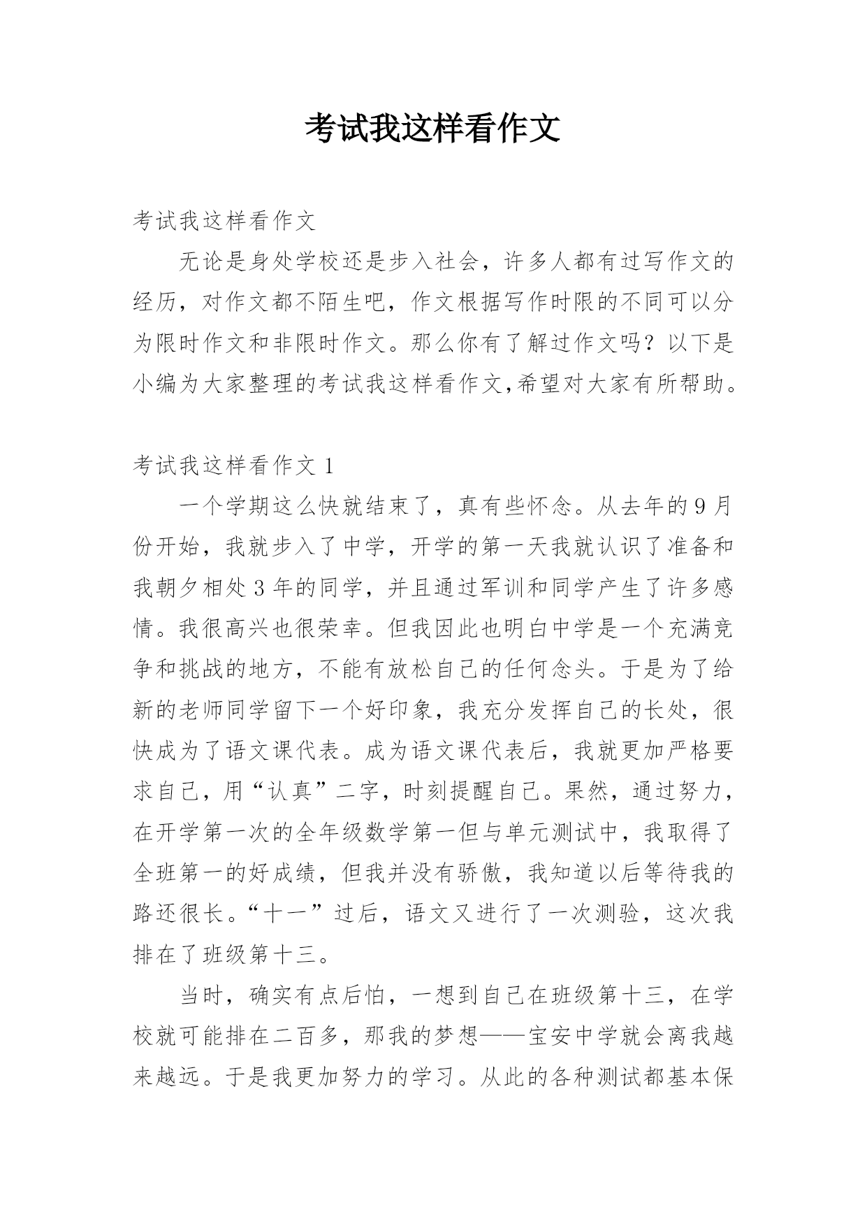 考试我这样看作文考试我这样看作文无论是身处学校还是步入社会,许多人都有过写作文的经历,对作文都不陌生吧,作文根据写作时限的不同可以分为限时作文和非限时作文。那么你有了解过作文吗?以下是小编为大家整理的考试我这样看作文,希望对大家有所帮助。考试我这样看作文1一个学期这么快就结束了,真有些怀念。从去年的9月份开始,我就步入了中学,开学的第一天我就认识了准备和我朝夕相处3年的同学,并且通过军训和同学产生了许多感情。我很高兴也很荣幸。但我因此也明白中学是一个充满竞争和挑战的地方,不能有放松自己的任何念头。于是为了