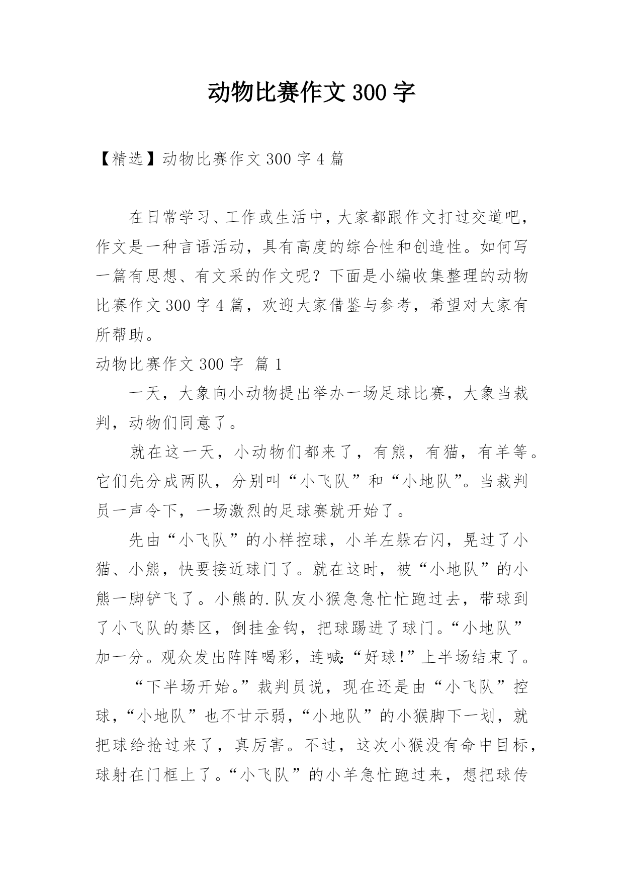 动物比赛作文300字【精选】动物比赛作文300字4篇在日常学习、工作或生活中,大家都跟作文打过交道吧,作文是一种言语活动,具有高度的综合性和创造性。如何写一篇有思想、有文采的作文呢?下面是小编收集整理的动物比赛作文300字4篇,欢迎大家借鉴与参考,希望对大家有所帮助。动物比赛作文300字篇1一天,大象向小动物提出举办一场足球比赛,大象当裁判,动物们同意了。就在这一天,小动物们都来了,有熊,有猫,有羊等。它们先分成两队,分别叫“小飞队”和“小地队”。当裁判员一声令下,一场激烈的足球赛就开始了。先由“小飞队”