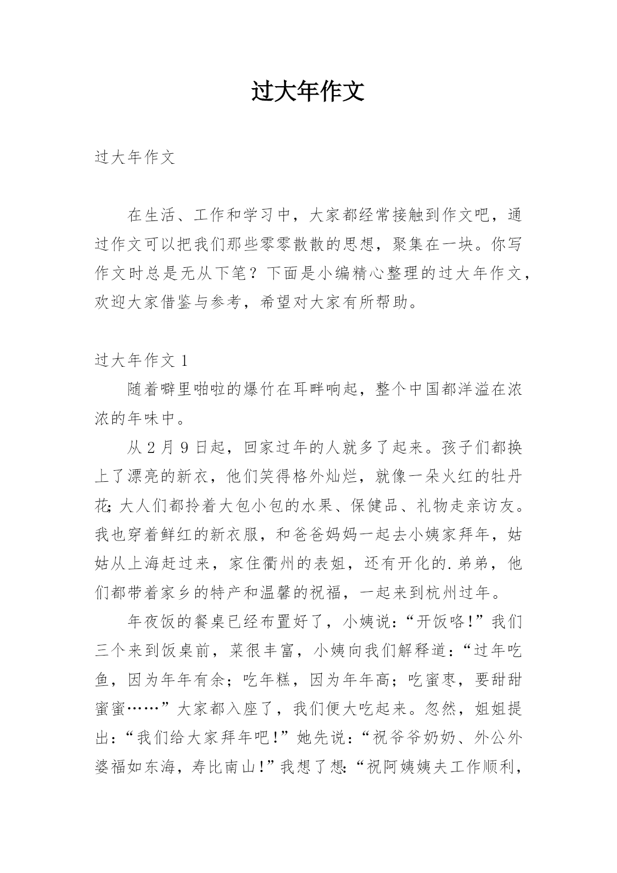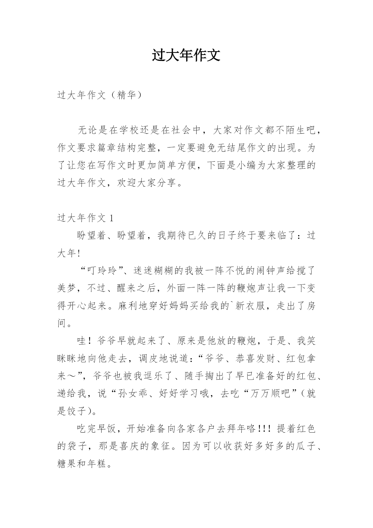过大年作文过大年作文(精华)无论是在学校还是在社会中,大家对作文都不陌生吧,作文要求篇章结构完整,一定要避免无结尾作文的出现。为了让您在写作文时更加简单方便,下面是小编为大家整理的过大年作文,欢迎大家分享。过大年作文1盼望着、盼望着,我期待已久的日子终于要来临了:过大年!“叮玲玲”、迷迷糊糊的我被一阵不悦的闹钟声给搅了美梦,不过、醒来之后,外面一阵一阵的鞭炮声让我一下变得开心起来。麻利地穿好妈妈买给我的`新衣服,走出了房间。哇!爷爷早就起来了、原来是他放的鞭炮,于是、我笑眯眯地向他走去,调皮地说道:“爷爷