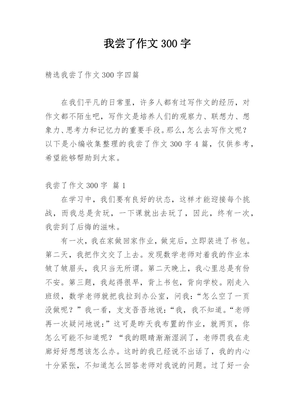 我尝了作文300字精选我尝了作文300字四篇在我们平凡的日常里,许多人都有过写作文的经历,对作文都不陌生吧,写作文是培养人们的观察力、联想力、想象力、思考力和记忆力的重要手段。那么,怎么去写作文呢?以下是小编收集整理的我尝了作文300字4篇,仅供参考,希望能够帮助到大家。我尝了作文300字篇1在学习中,我们要有良好的状态,这样才能迎接每个挑战,而我总是贪玩,一下课就出去玩了,因此,终有一次,我尝到了后悔的滋味。有一次,我在家做回家作业,做完后,立即装进了书包。第二天,我把作文交了上去。发现数学老师对着我的