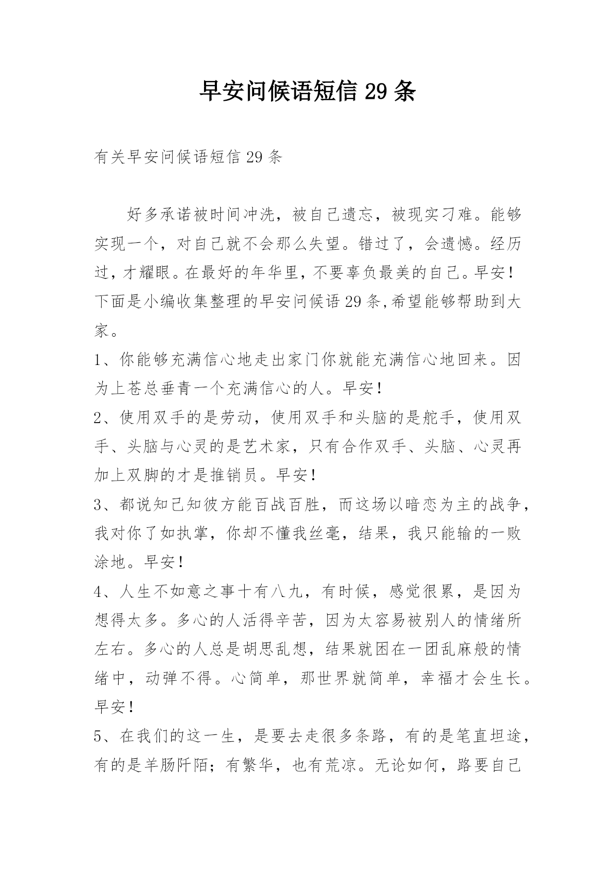 早安问候语短信29条有关早安问候语短信29条好多承诺被时间冲洗,被自己遗忘,被现实刁难。能够实现一个,对自己就不会那么失望。错过了,会遗憾。经历过,才耀眼。在最好的年华里,不要辜负最美的自己。早安!下面是小编收集整理的早安问候语29条,希望能够帮助到大家。1、你能够充满信心地走出家门你就能充满信心地回来。因为上苍总垂青一个充满信心的人。早安!2、使用双手的是劳动,使用双手和头脑的是舵手,使用双手、头脑与心灵的是艺术家,只有合作双手、头脑、心灵再加上双脚的才是推销员。早安!3、都说知己知彼方能百战百胜,而这