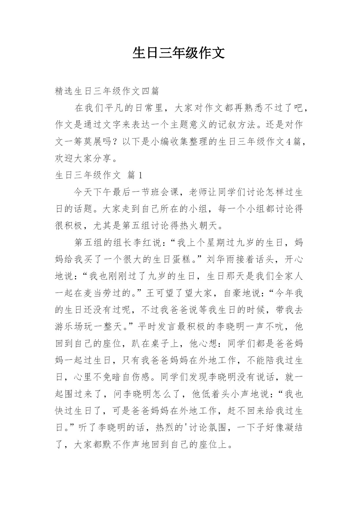 生日三年级作文精选生日三年级作文四篇在我们平凡的日常里,大家对作文都再熟悉不过了吧,作文是通过文字来表达一个主题意义的记叙方法。还是对作文一筹莫展吗?以下是小编收集整理的生日三年级作文4篇,欢迎大家分享。生日三年级作文篇1今天下午最后一节班会课,老师让同学们讨论怎样过生日的话题。大家走到自己所在的小组,每一个小组都讨论得很积极,尤其是第五组讨论得热火朝天。第五组的组长李红说:“我上个星期过九岁的生日,妈妈给我买了一个很大的生日蛋糕。”刘华雨接着话头,开心地说:“我也刚刚过了九岁的生日,生日那天是我们全家人